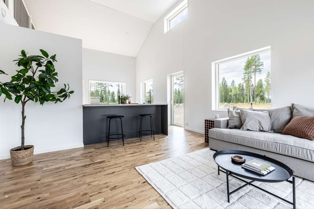 Vardagsrum: Ett ljust och rymligt vardagsrum med öppen planlösning mot köket, vilket skapar en luftig och social atmosfär. Vardagsrummet har stora fönster, vilket ger ett fantastiskt ljusinsläpp och fin utsikt över omgivande natur.