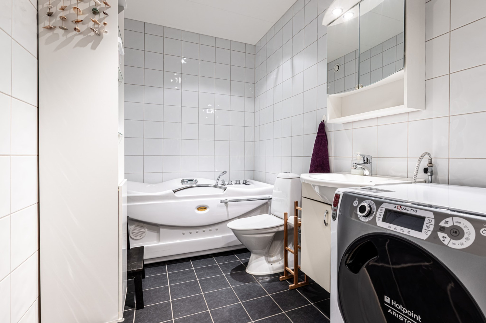 Stilrent badrum med kakel och klinkers i klassiska, tidlösa nyanser. Här finns komfortabel golvvärme, ett rymligt handfat med kommod, badkar, spegelskåp med belysning, toalett, tvättmaskin samt ett skåp för extra förvaring.