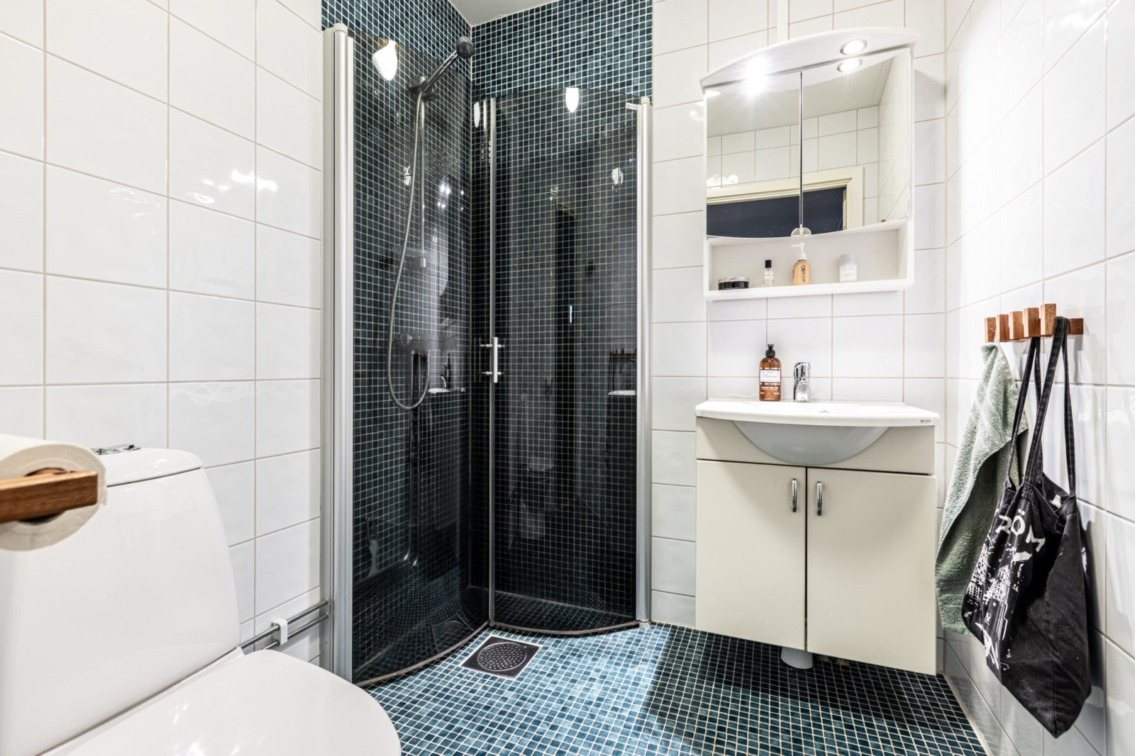Stilrent badrum med kakel och klinkers i klassiska, tidlösa nyanser. Här finns ett rymligt handfat med kommod, spegelskåp med belysning, dusch med vikbara glasväggar samt en toalett.