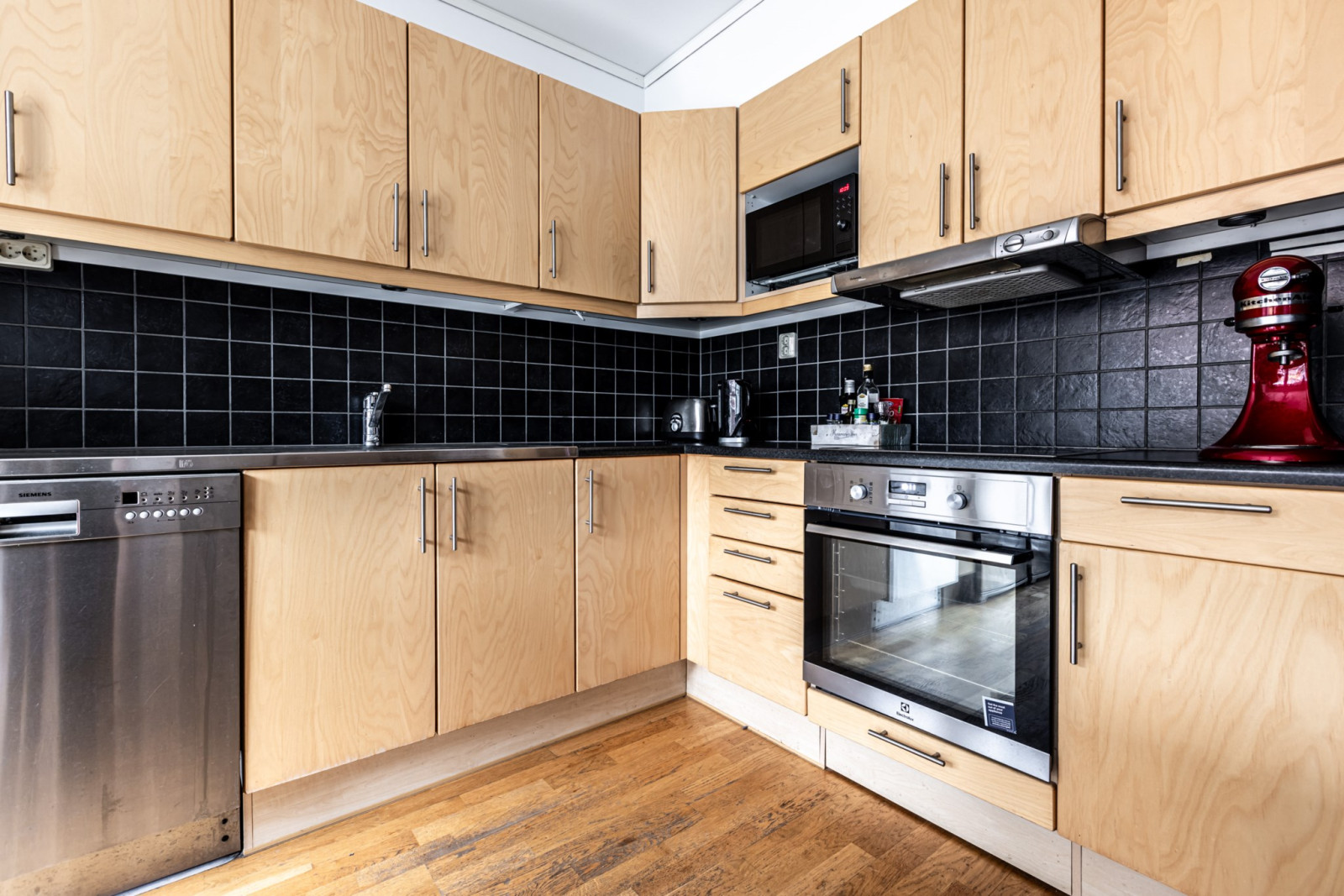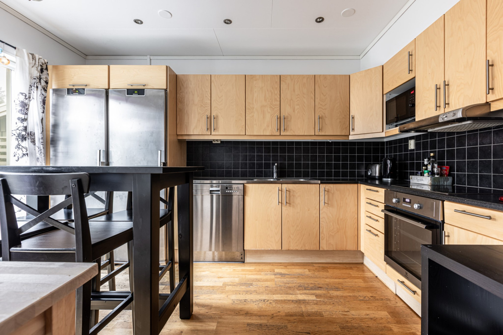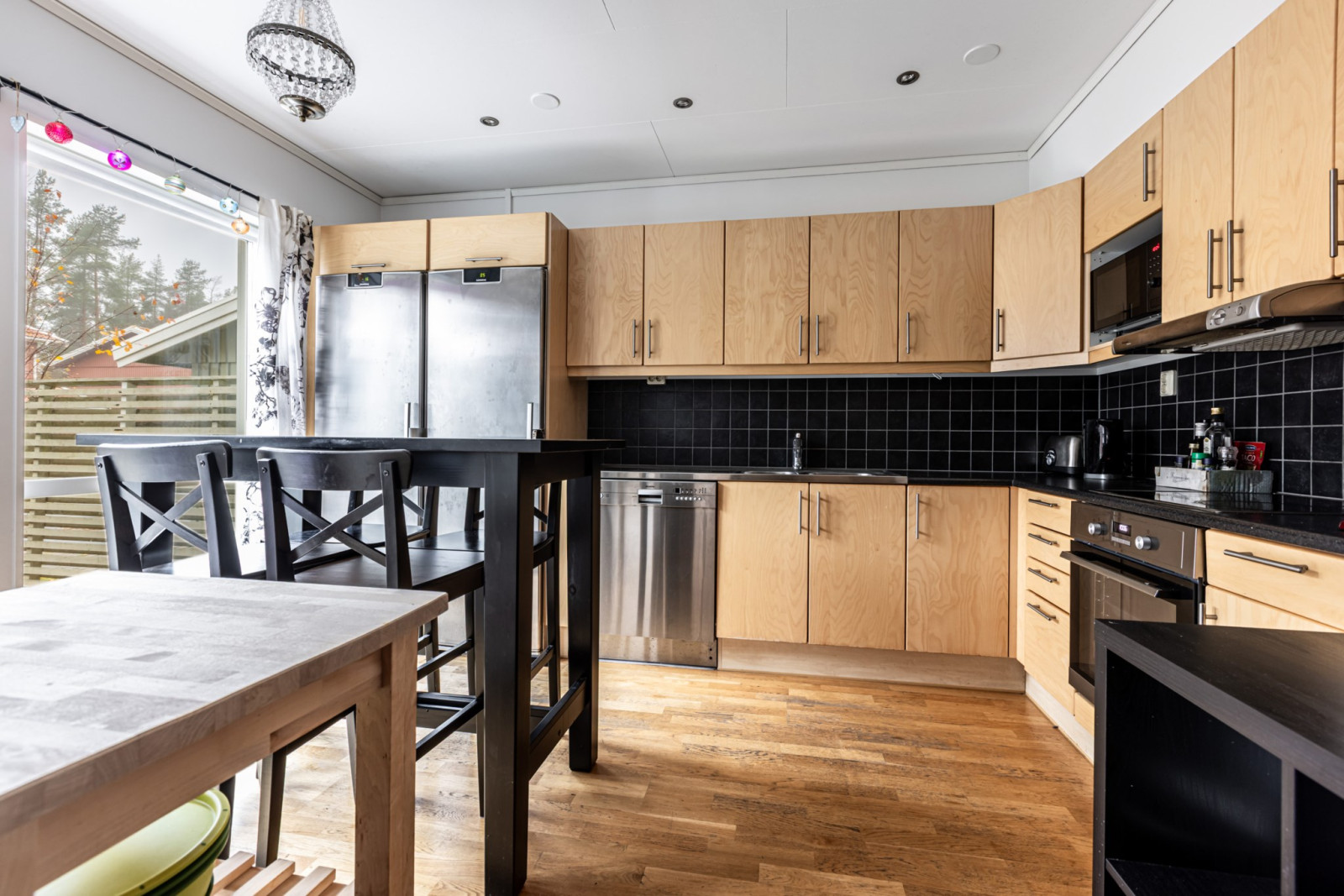 Rymligt och ljust kök med ett generöst ljusinsläpp från stora fönsterpartier. Köket har gått om arbetsytor och förvaringsmöjligheter i form av över och underskåp och plats för en matgrupp. Köket är utrustat med fullstor kyl och frys, spis, köksfläkt, mikrovågsugn och diskmaskin.