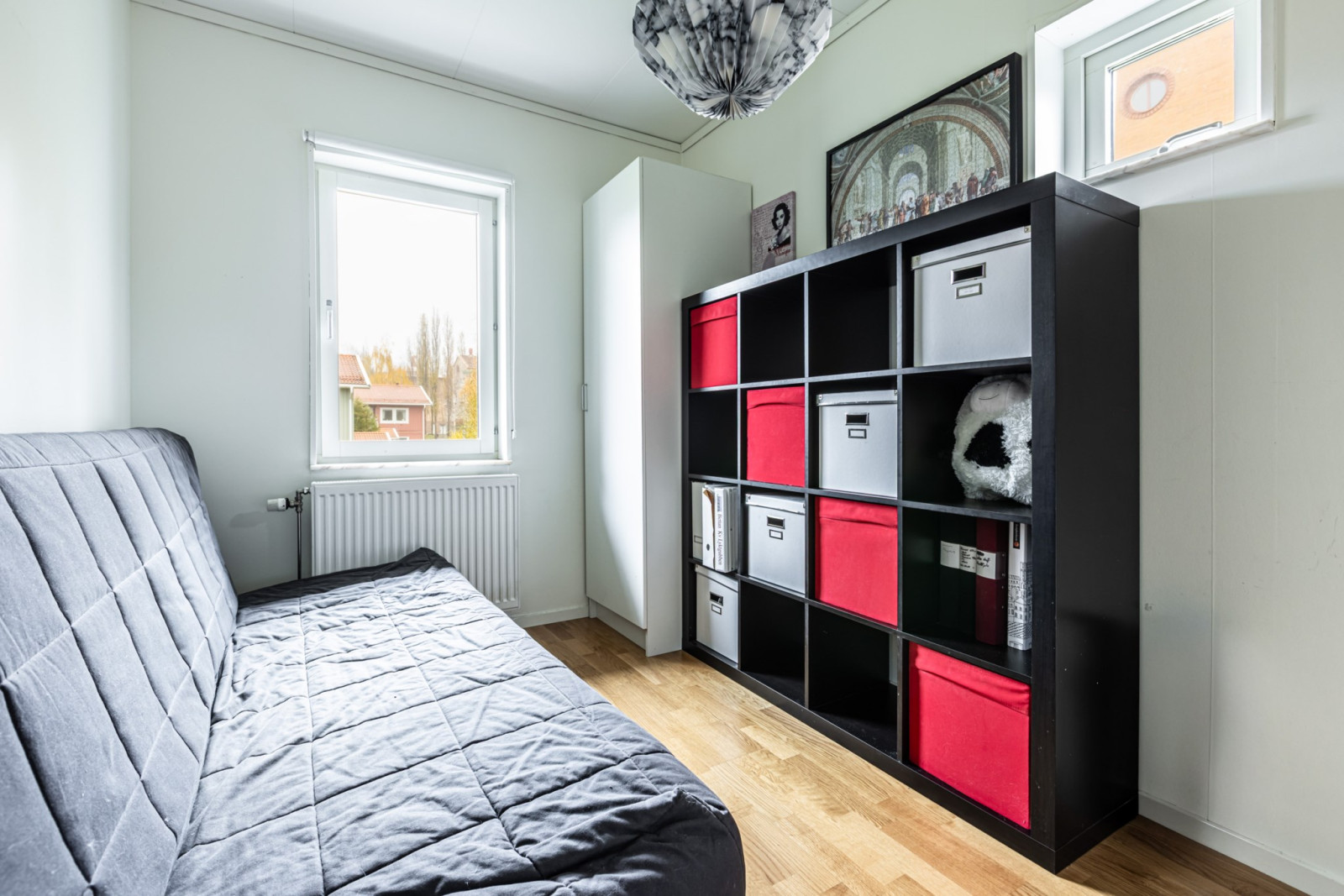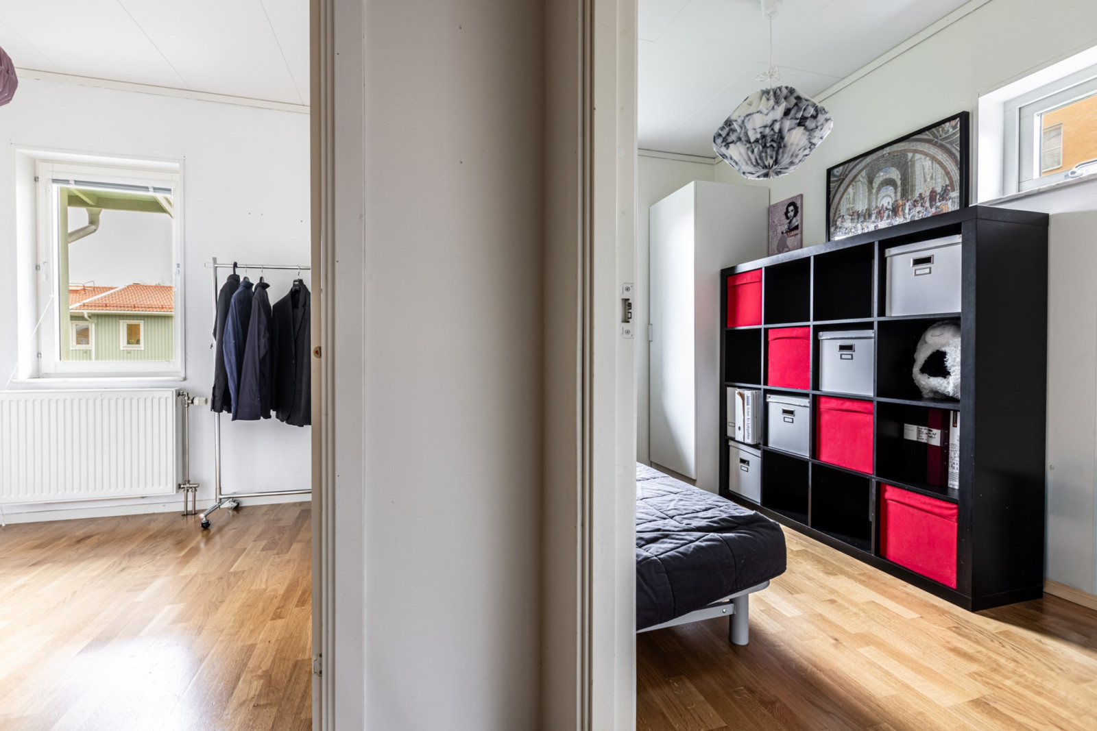 Rymligt och ljust sovrum med plats för en dubbelsäng med tillhörande nattduksbord samt kompletterande möblering om så önskas. Här har man även gott om förvaringsmöjligheter i formen av platsbyggda garderober.