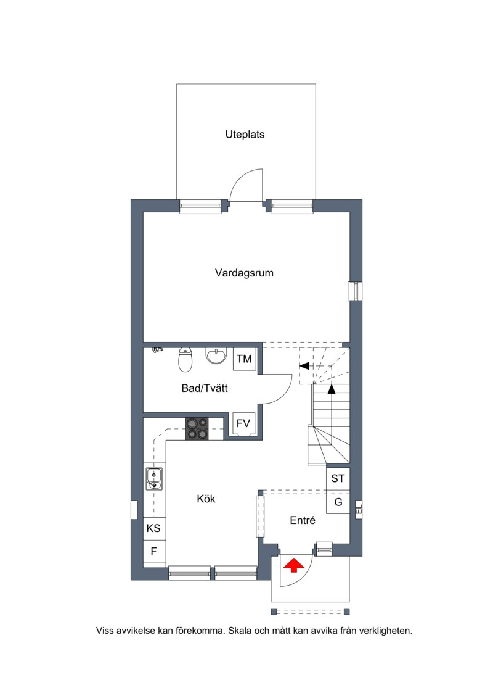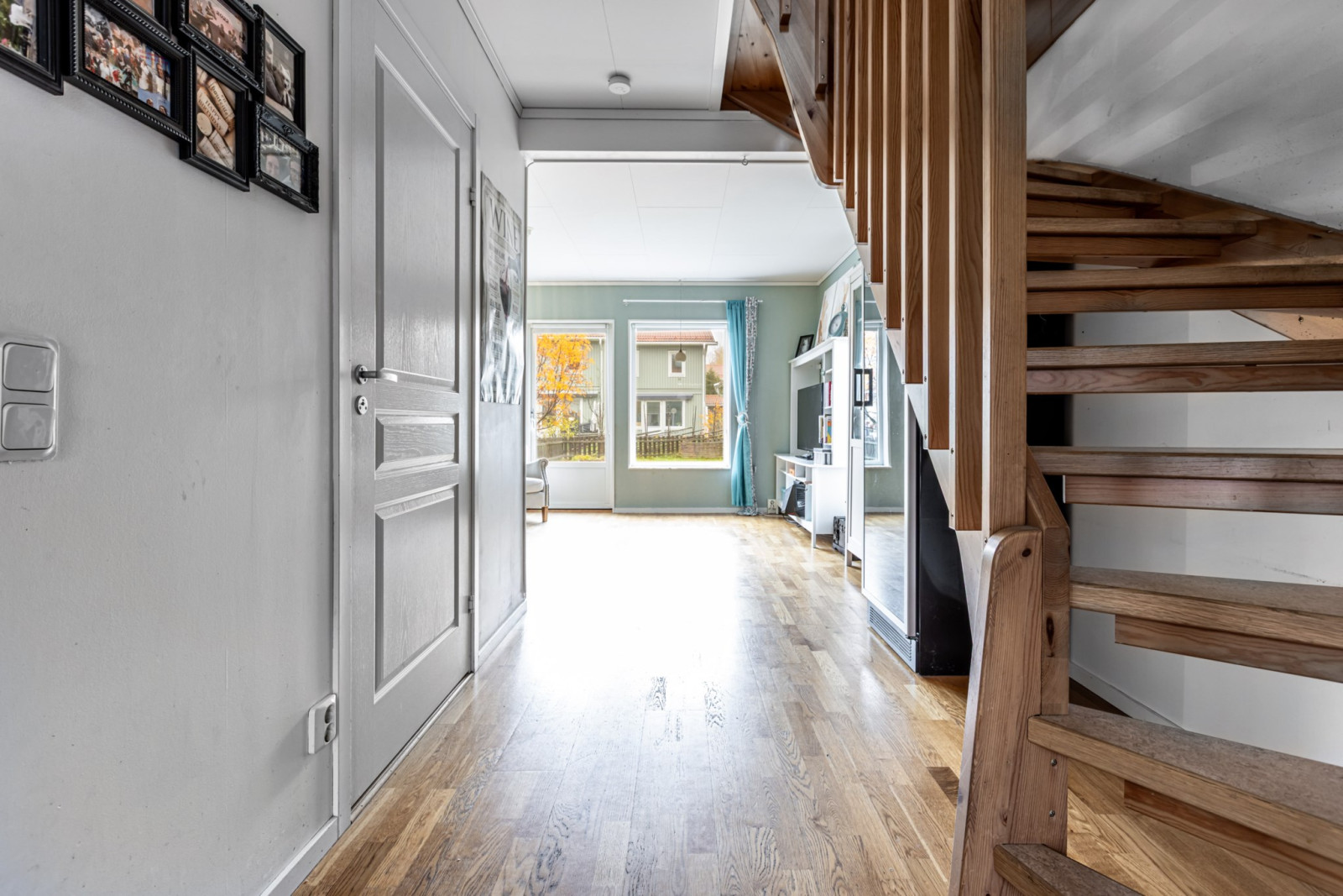 Entréplan bjuder på en inbjudande hall, ett ljust kök med matplats, ett rymligt vardagsrum med utgång till den soliga altanen i österläge samt ett fräscht badrum. Perfekt för både vardagsliv och umgänge!
