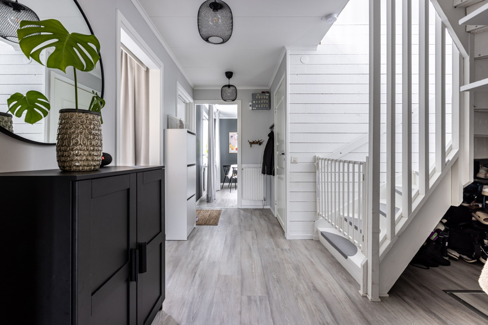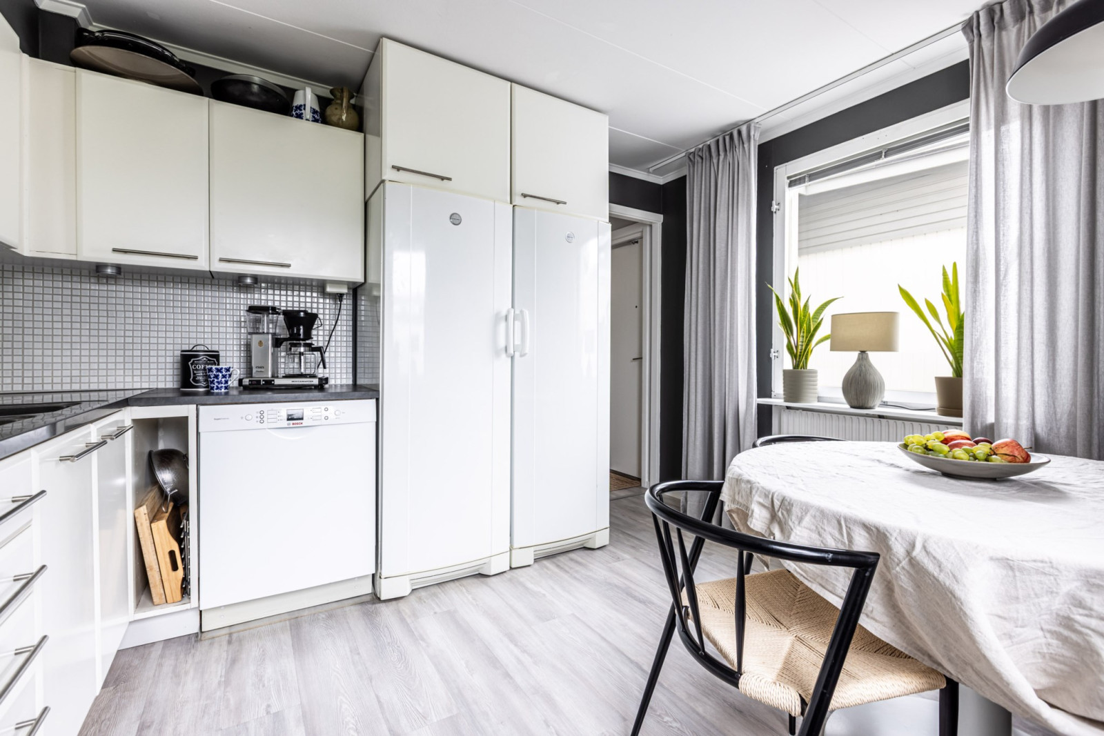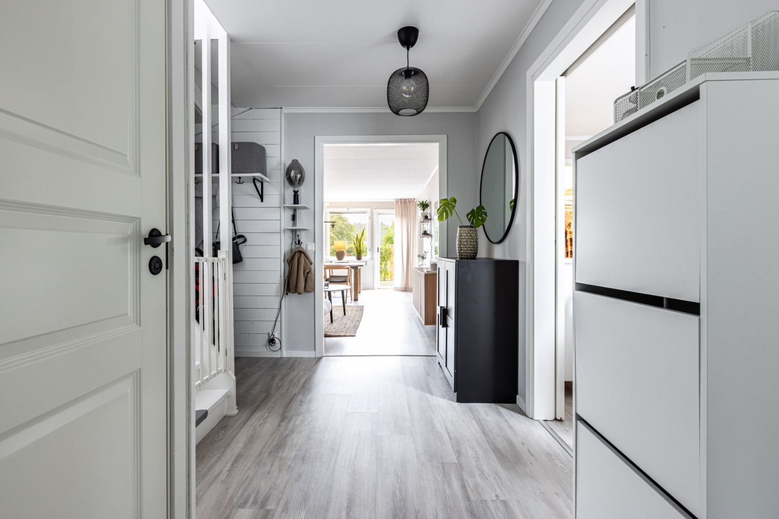 Entréplanet bjuder på ett separat kök med fönster mot framsidan – här finns gott om plats för ett rejält matbord. Från köket når du en rymlig hall som binder ihop bostaden och leder vidare till det stora vardagsrummet. Här flödar ljuset in från baksidan och via altandörren tar du dig ut till den insynsskyddade uteplatsen – en självklar plats för sommarens middagar och avkoppling.
