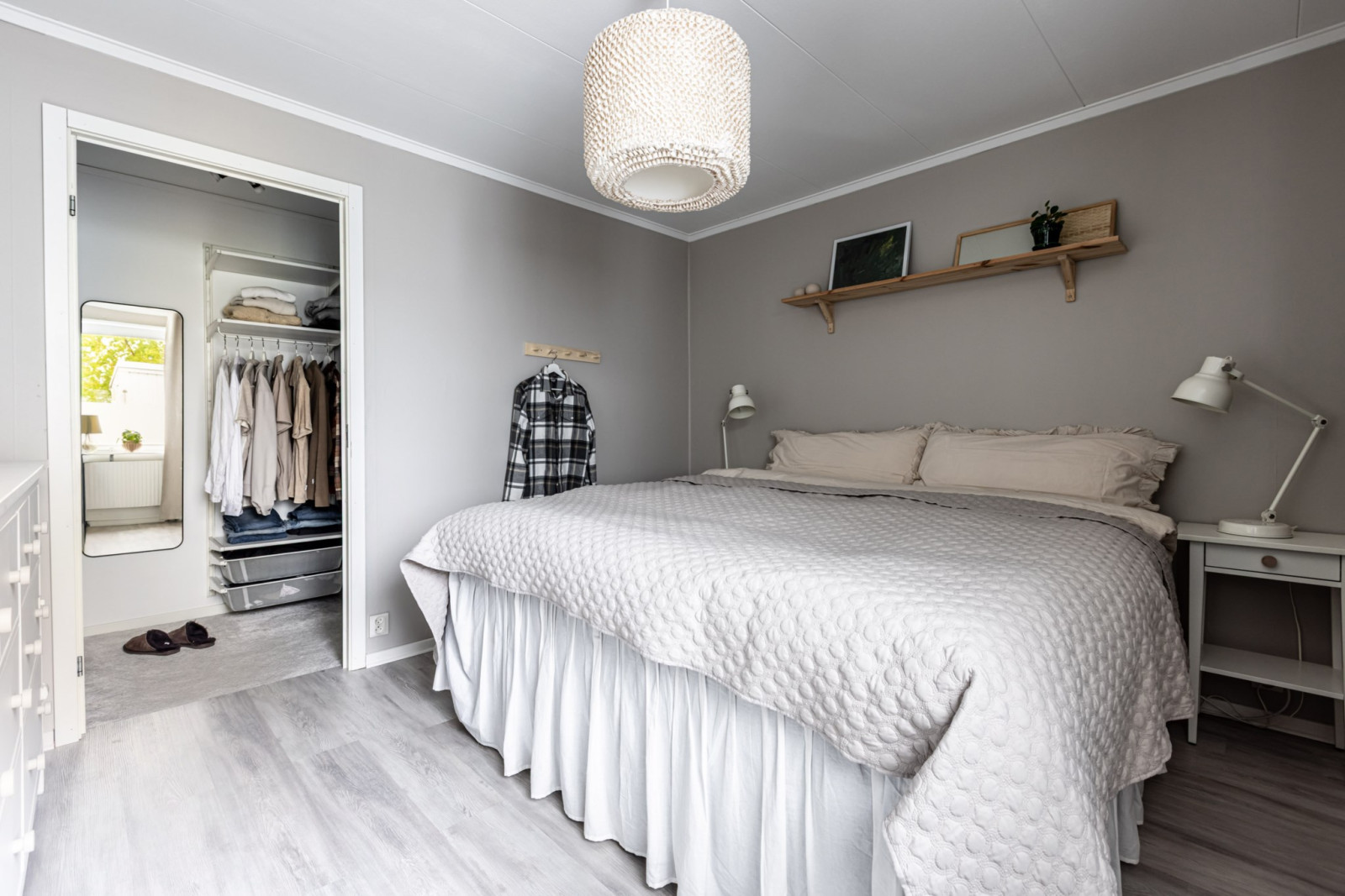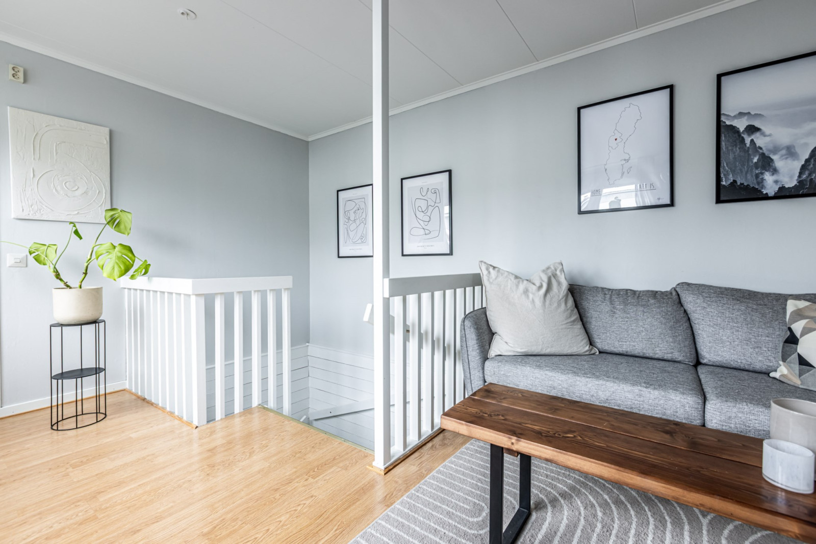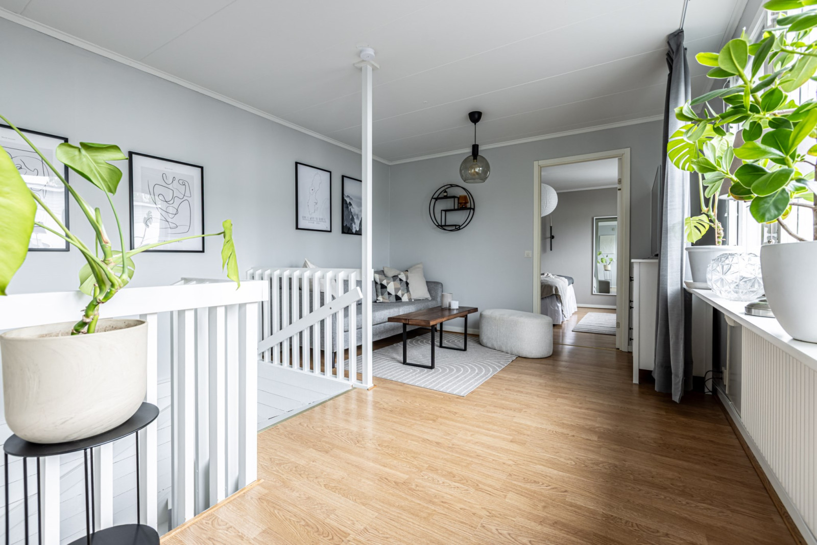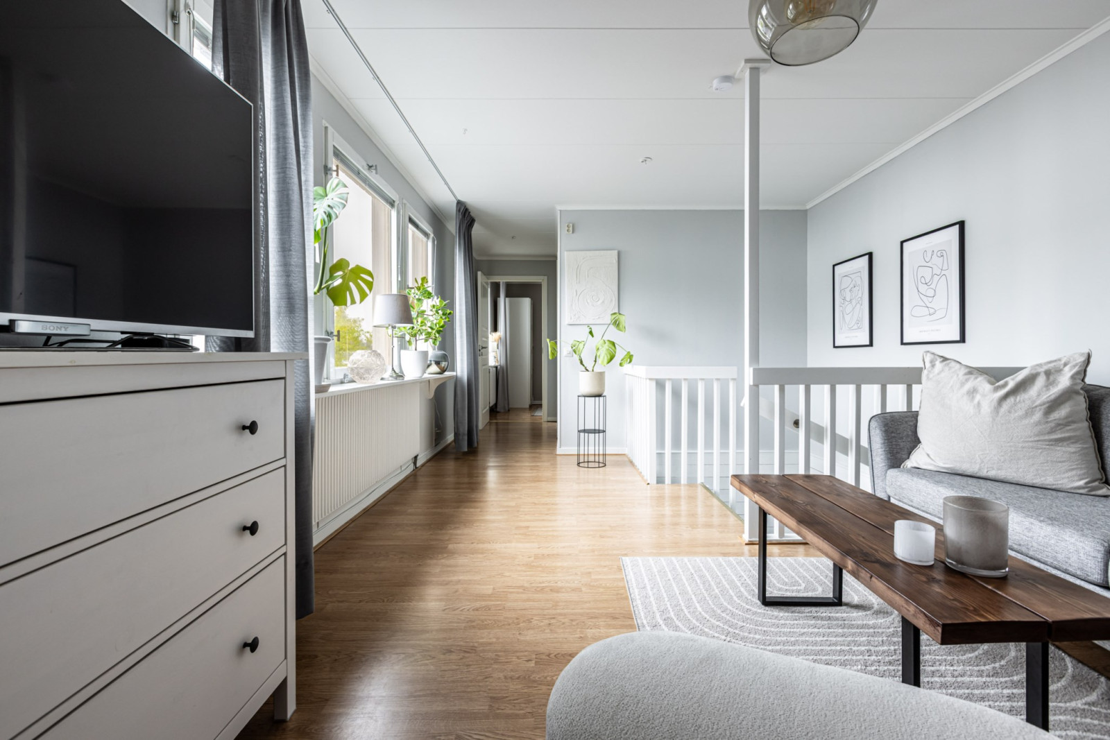 På entréplanet finns även två sovrum samt ett badrum. På övre plan väntar ytterligare två sovrum, ett mindre allrum/social yta som kan fungera som tv-hörna, arbetsplats eller lekrum, samt ett rymligt badrum med både tvättmaskin och torktumlare som gör vardagen smidig.