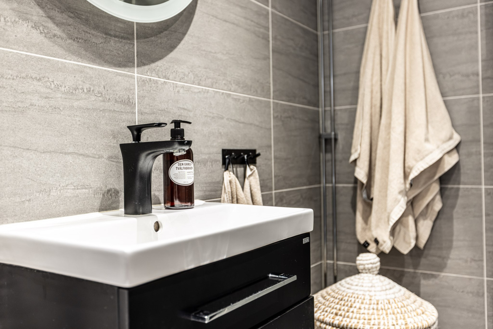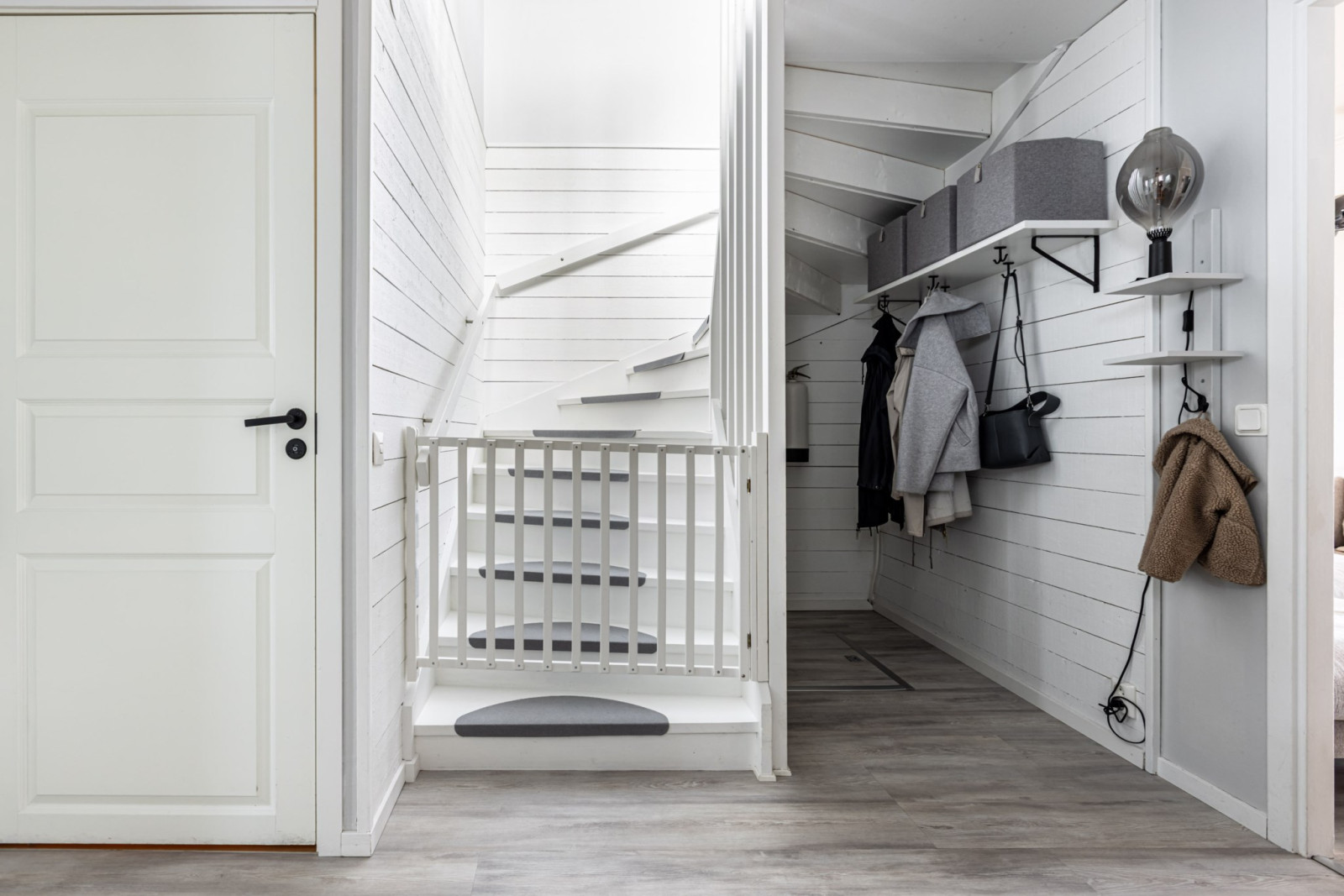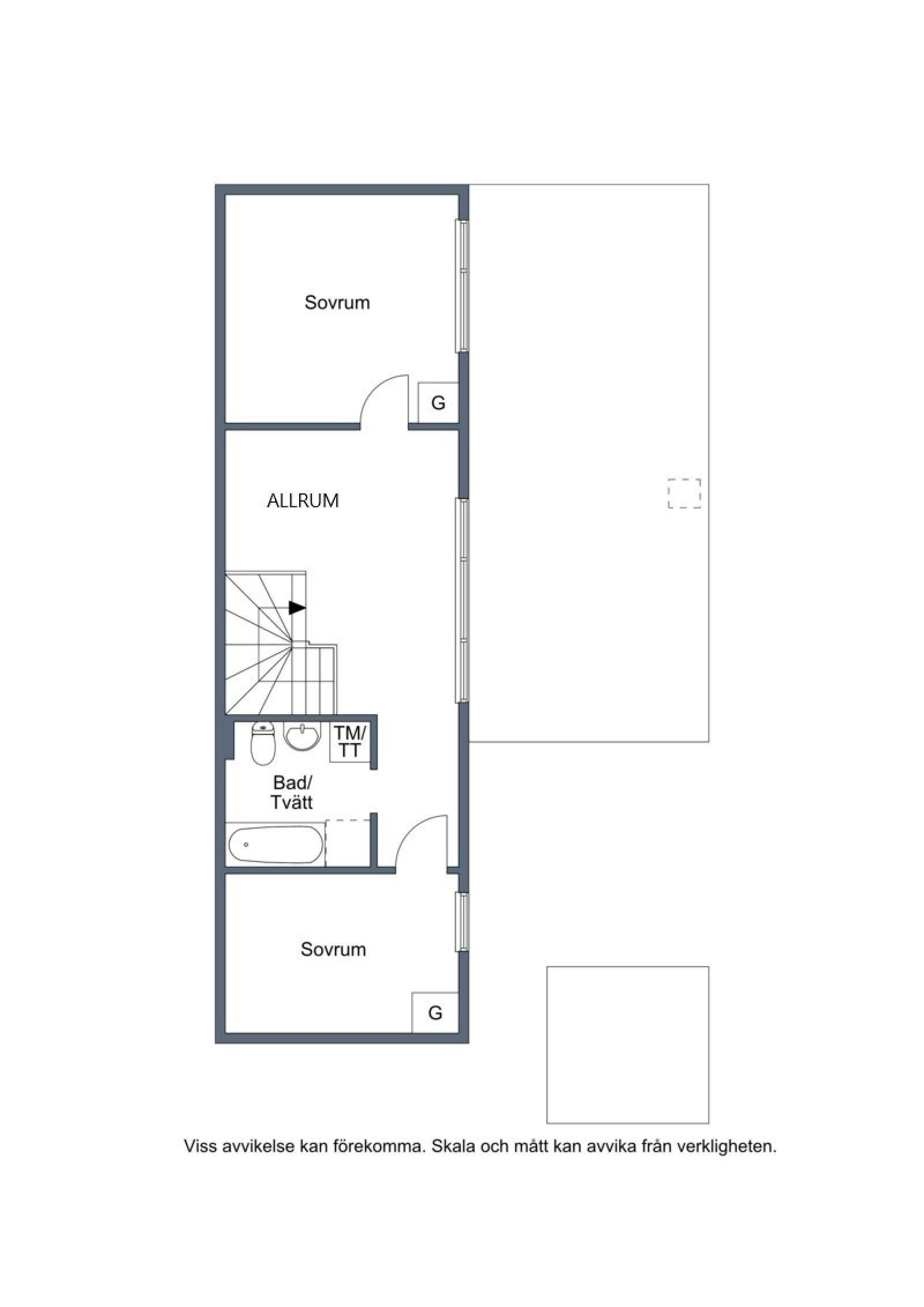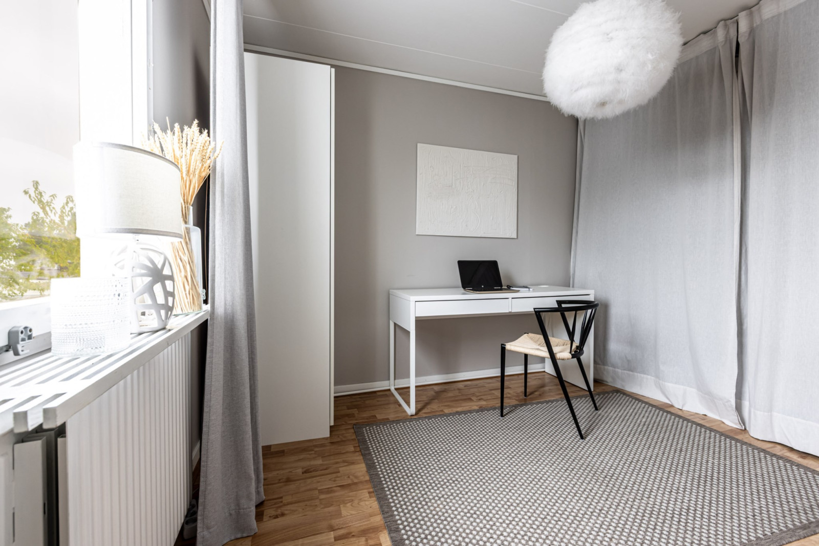 På entréplanet finns även två sovrum samt ett badrum. På övre plan väntar ytterligare två sovrum, ett mindre allrum/social yta som kan fungera som tv-hörna, arbetsplats eller lekrum, samt ett rymligt badrum med både tvättmaskin och torktumlare som gör vardagen smidig.