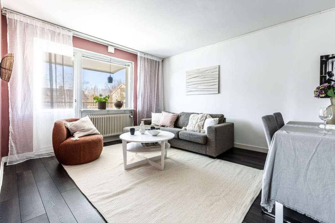 Till höger om hallen finner ni det ljusa och luftiga vardagsrummet. Goda möbleringsmöjligheter med utrymme för variation. Plats finns för matsalsbord, soffa och soffbord samt tv-bänk. Från vardagsrummet tar ni er ut på den nya och avsevärt större balkongen med sydväst-/västerläge.