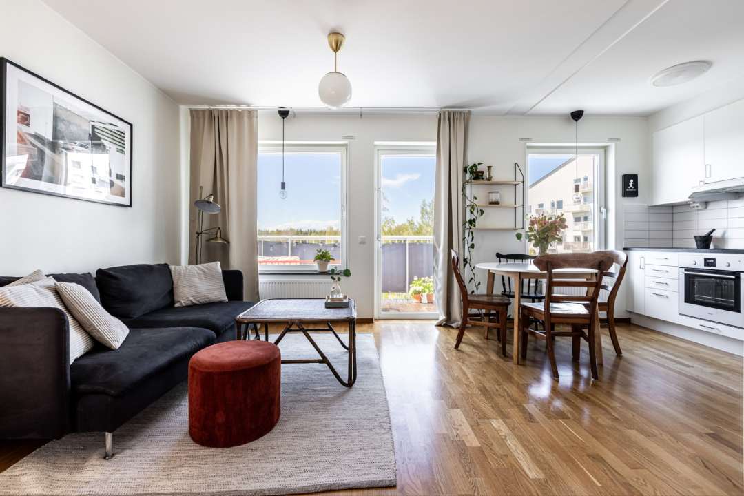 Vardagsrummet rymmer både soffa och matplats – här kan du möblera efter egen smak och behov. Från vardagsrummet nås den generösa balkongen där du kan njuta av generöst med sol.