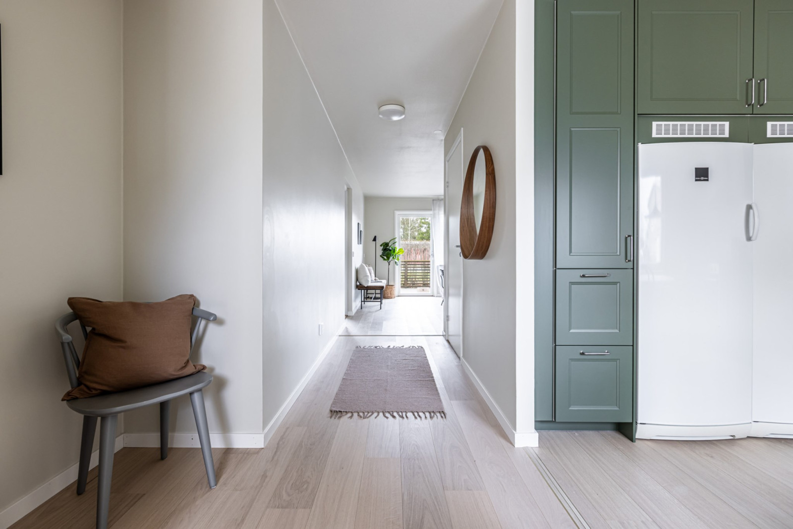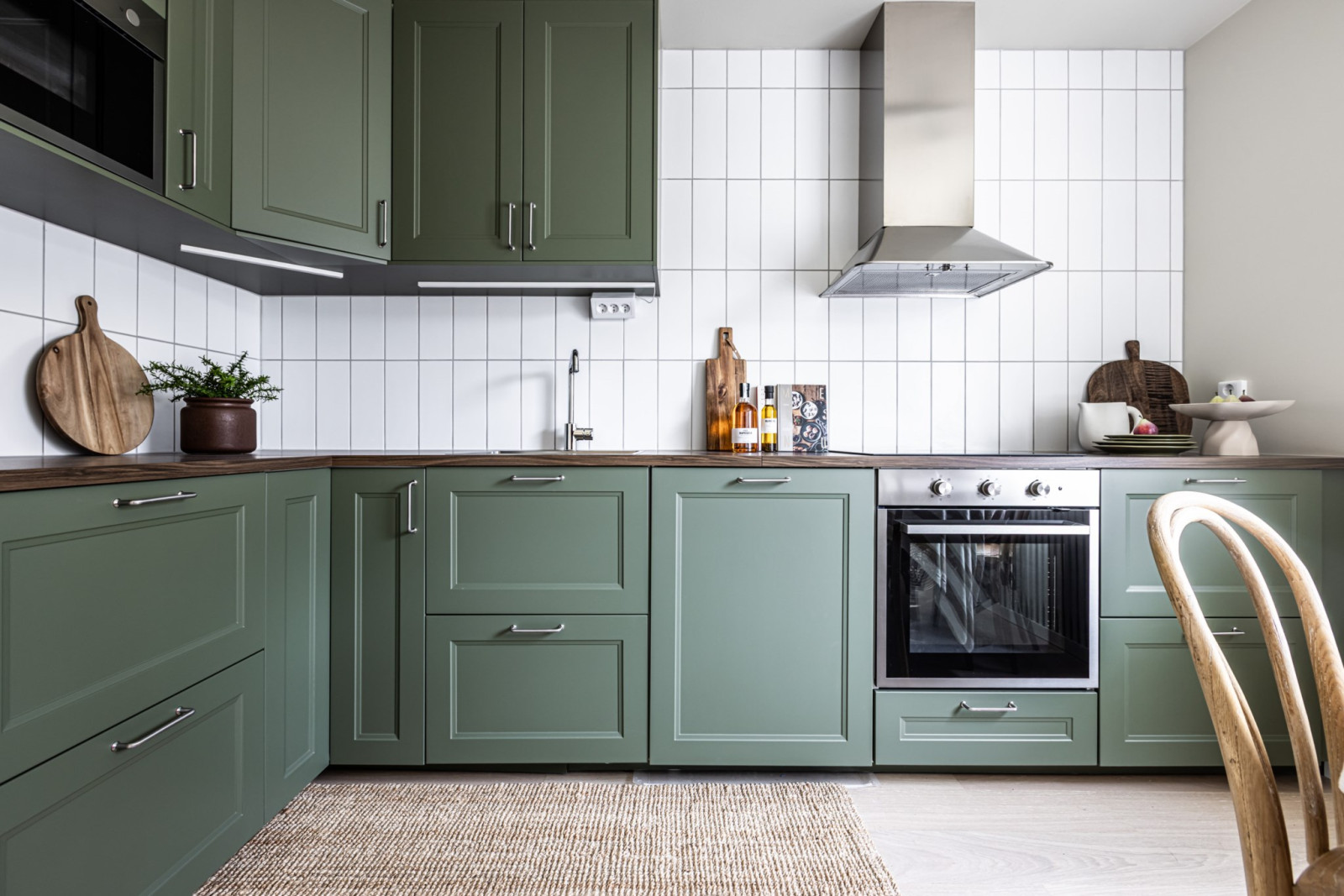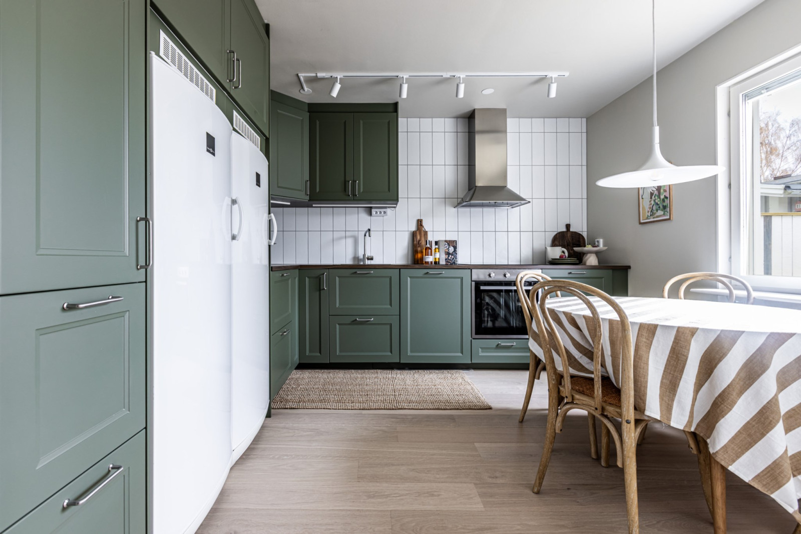 Stilrent kök i grön kulör med goda arbetsytor och gott om förvaring i form av över- och underskåp samt lådor. Köket är försett med en diskmaskin, fullstor kyl och frys, stekhäll, ugn, mikro och köksfläkt.