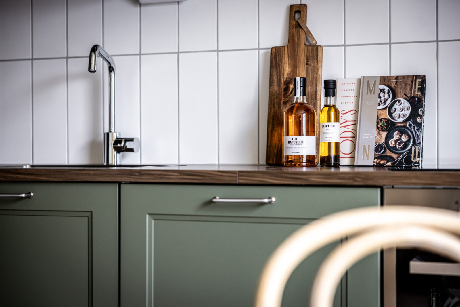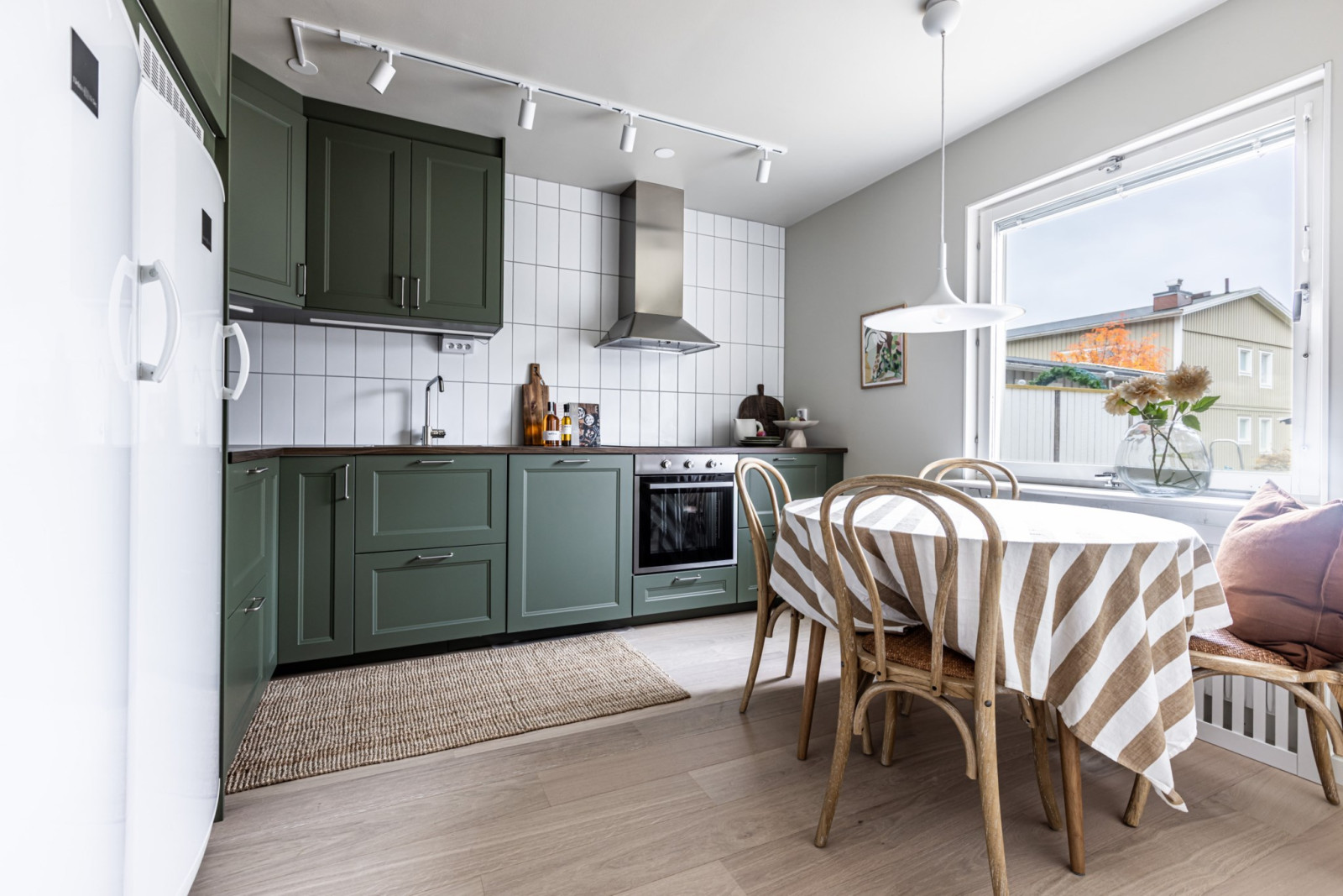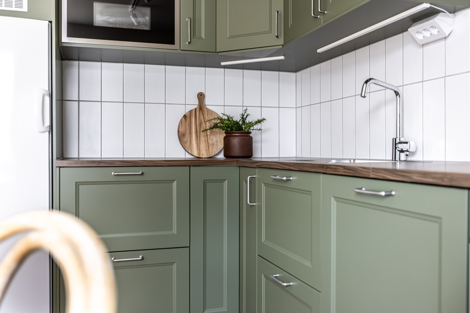 Stilrent kök i grön kulör med goda arbetsytor och gott om förvaring i form av över- och underskåp samt lådor. Köket är försett med en diskmaskin, fullstor kyl och frys, stekhäll, ugn, mikro och köksfläkt.