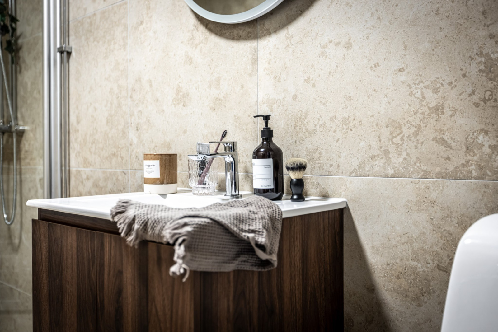 Nytt kakel, klinker, handfat med kommod, dusch, duschväggar och spegel i badrum - 2025