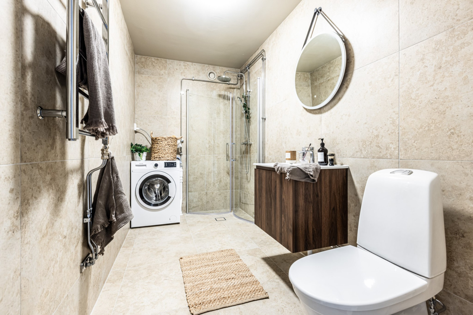 Badrummet måttar god storlek, ytskikten utgörs av härlig beige kakel och klinker på väggarna och golvet i smakfull stil. Badrummet är försett med wc, handfat med komod, spegel, golvvärme, tvättmaskin och dusch med vikbara glasväggar.