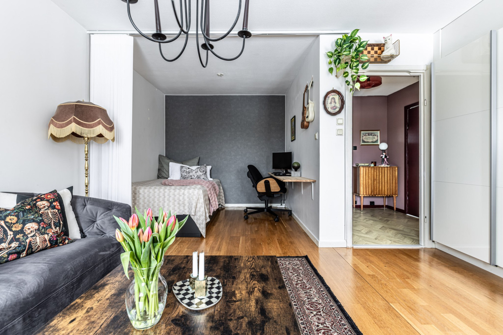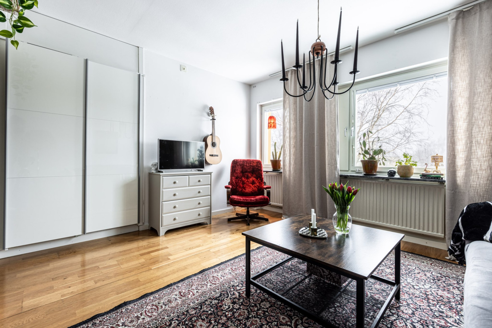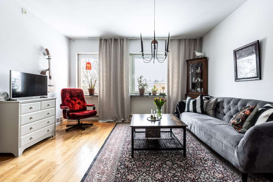 Allrummet disponeras rakt fram från hallen sett. Rummet går i vinkel vilket ger en naturlig vardagsrumsdel samt en separat sovalkov. I vardagsrummet får ni plats med soffa, soffbord och tv-bänk.