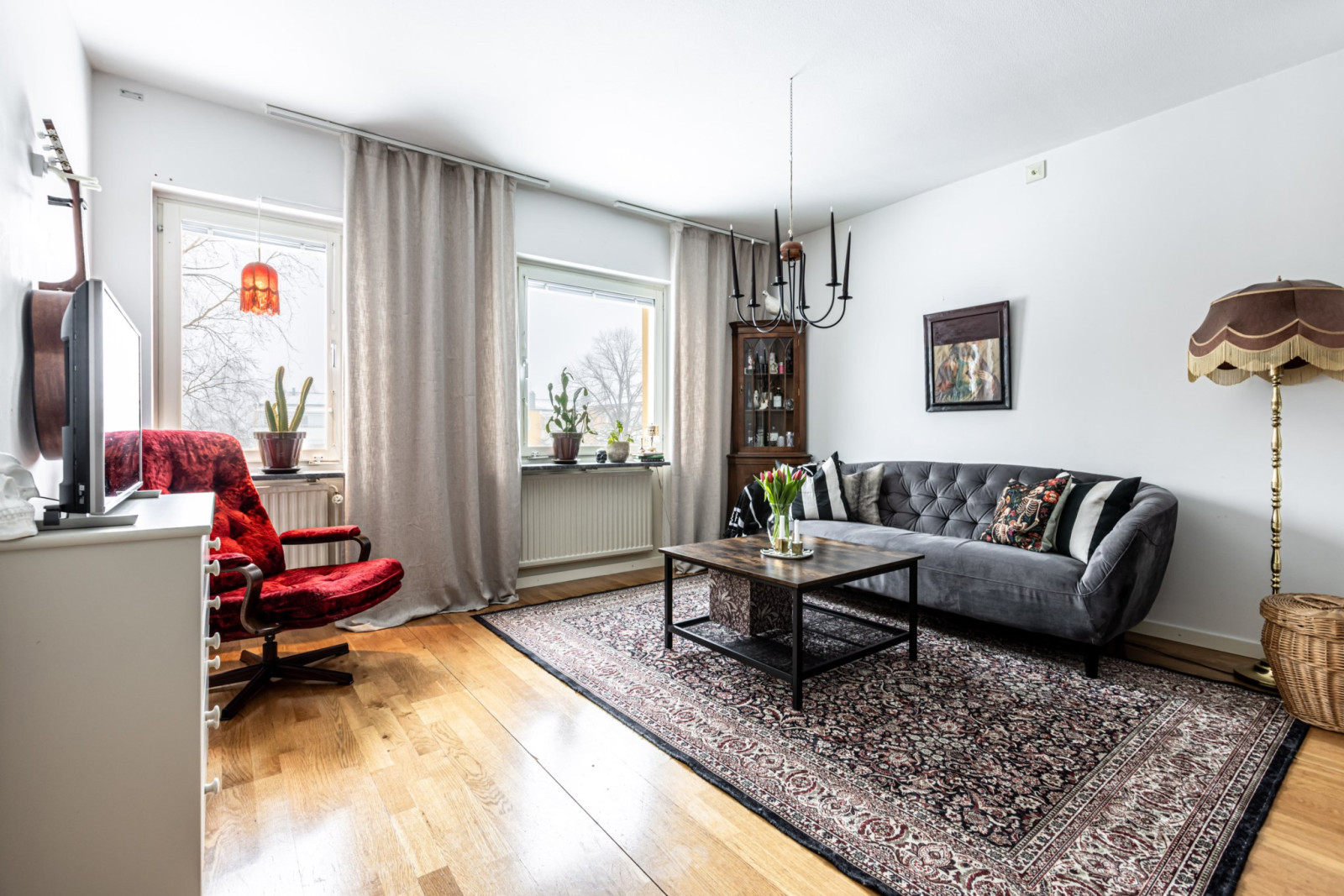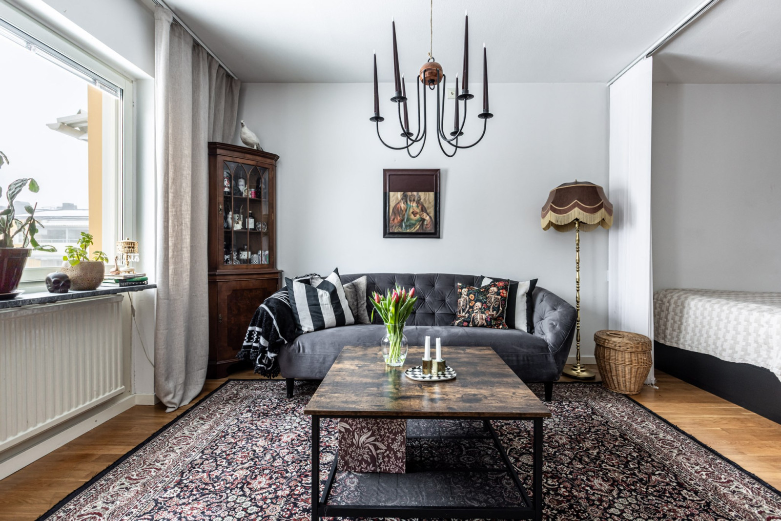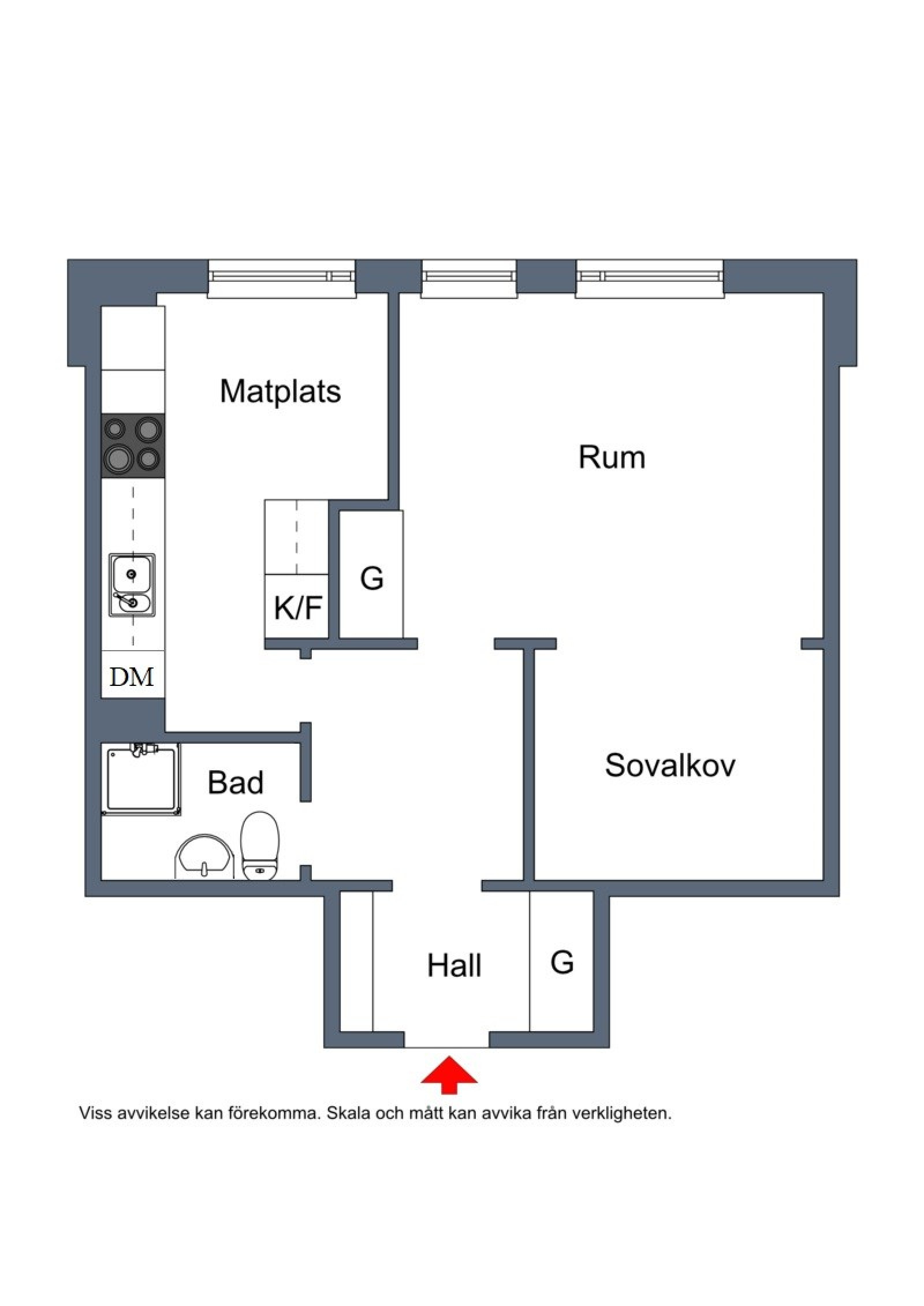 Allrummet disponeras rakt fram från hallen sett. Rummet går i vinkel vilket ger en naturlig vardagsrumsdel samt en separat sovalkov. I vardagsrummet får ni plats med soffa, soffbord och tv-bänk.
