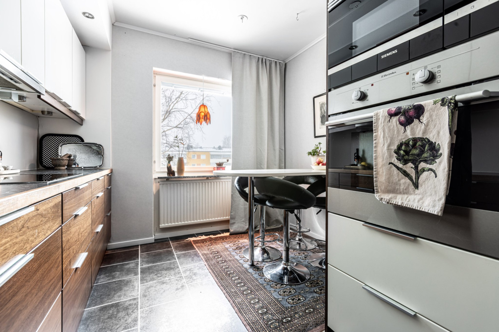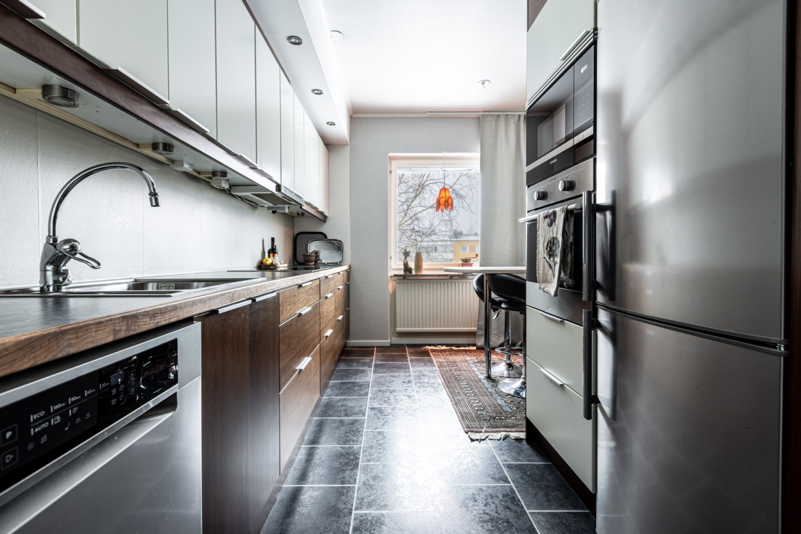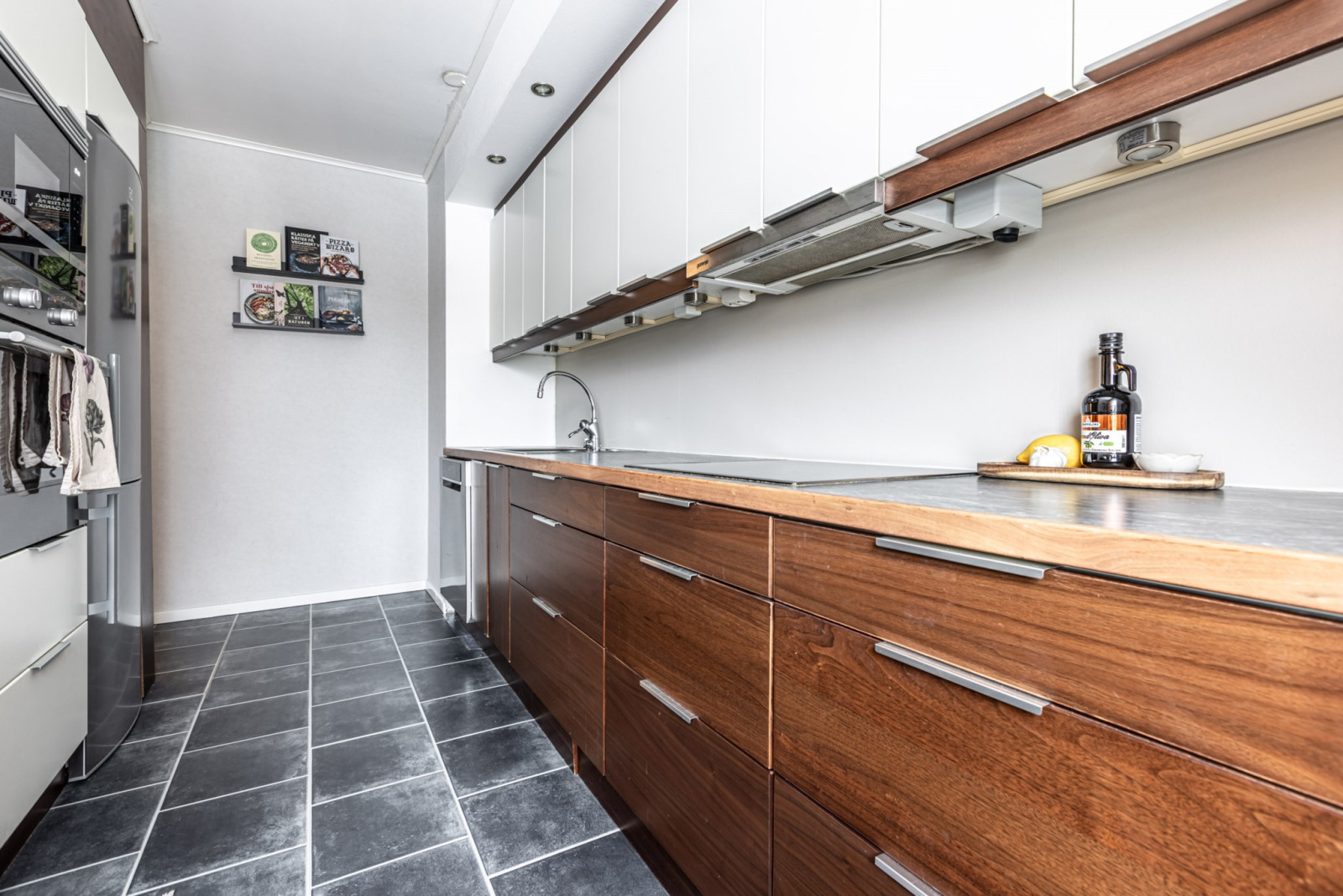 Köket ligger även till vänster om hallen. Köket är väl tilltaget i storlek vilket ger er gått om förvaring i överskåp och lådor samt generöst med arbetsytor. Maskinparken består av kyl/frys, integrerad diskmaskin, inbyggd ugn och mikro, induktionshäll och fläkt. Plats för matbord.