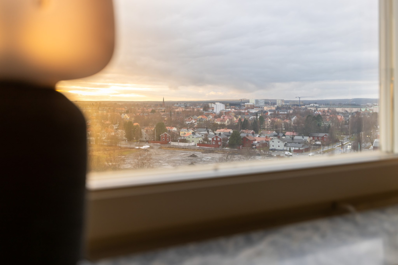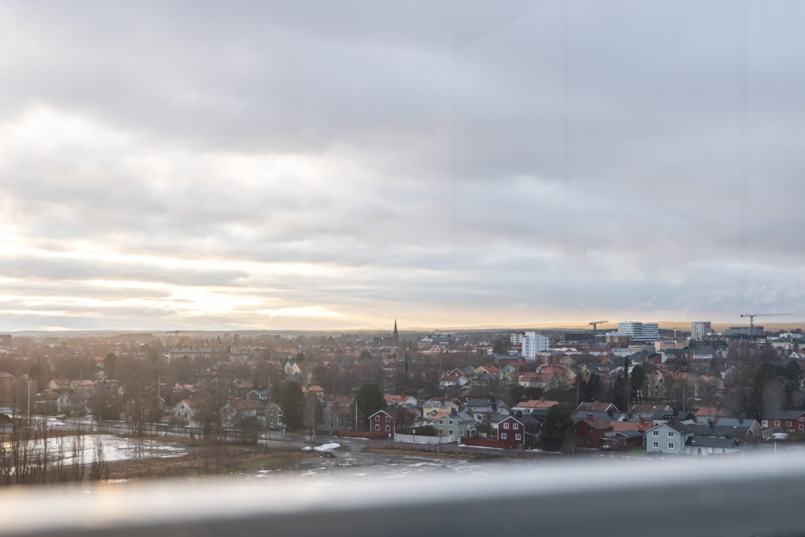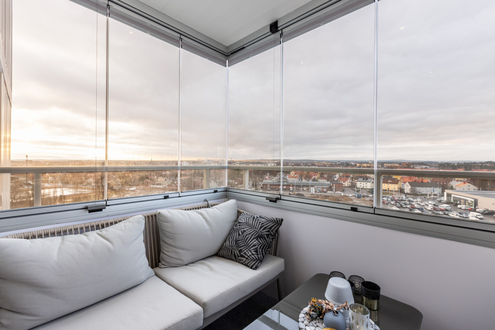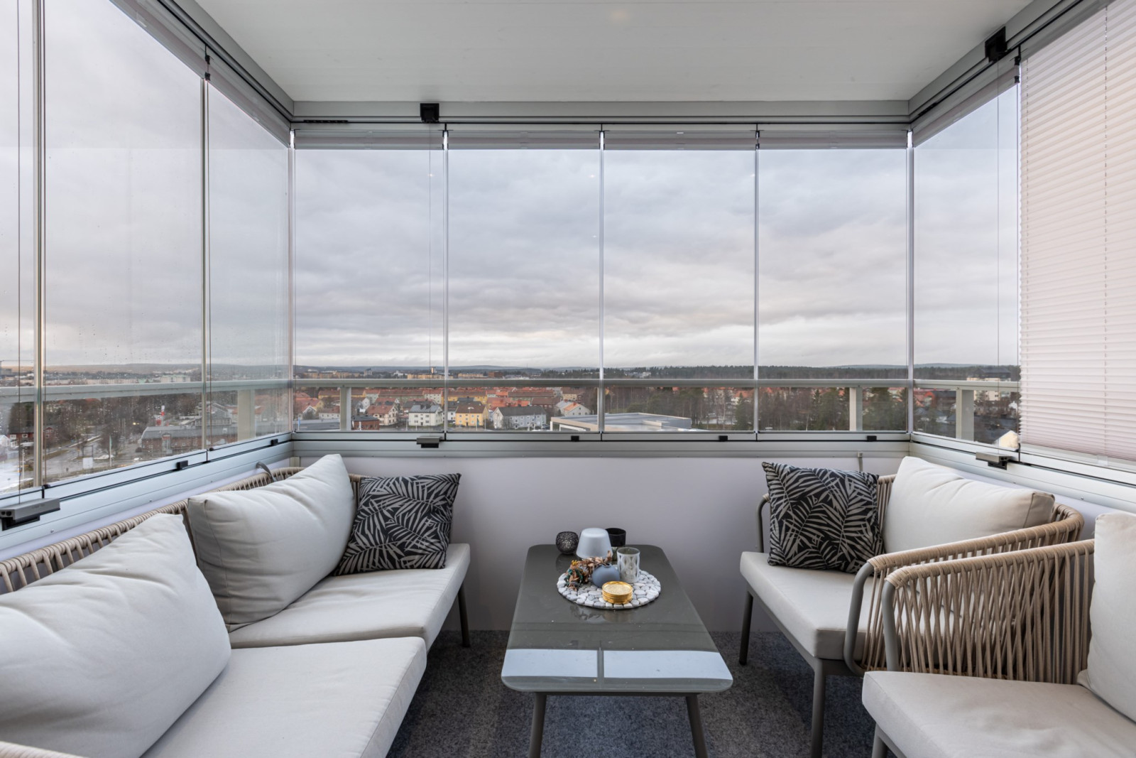 Inglasad balkong högst upp i huset med utsikt över Umeå. -