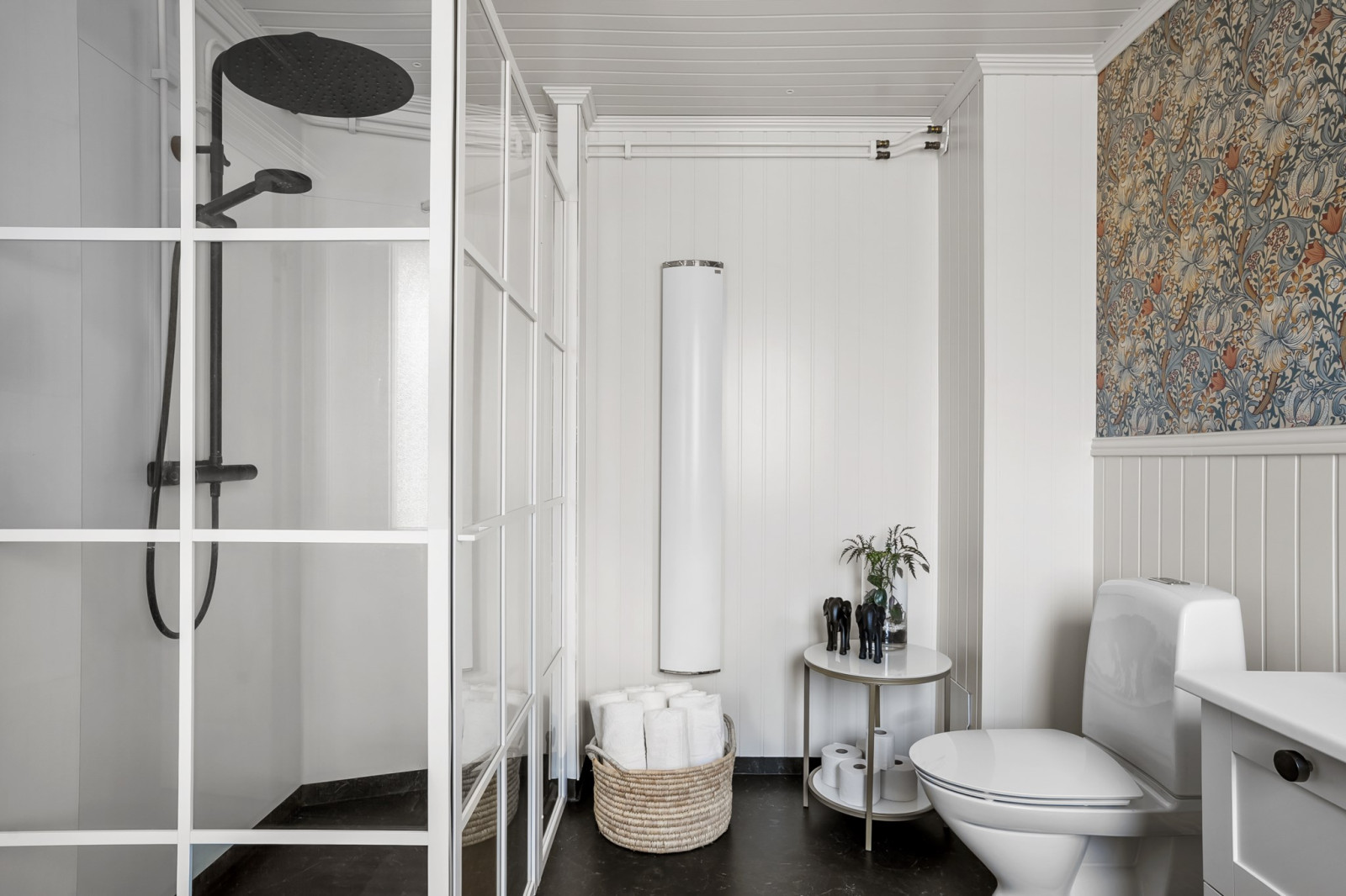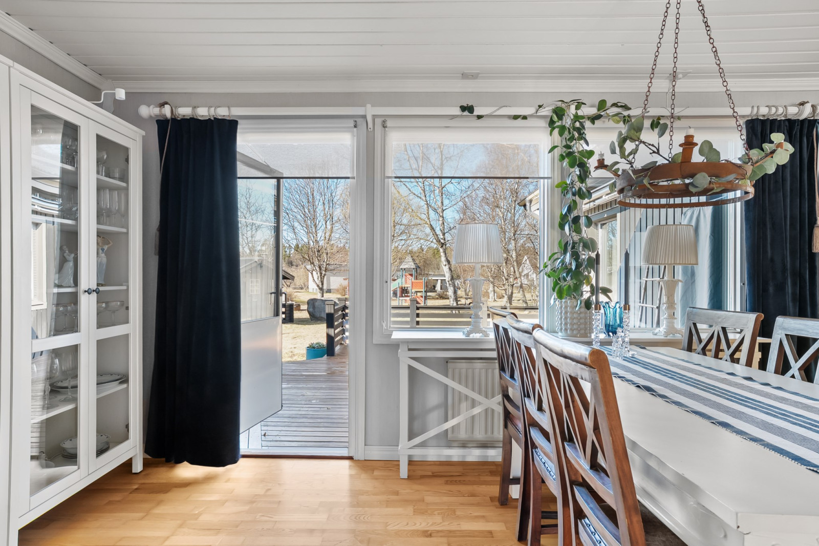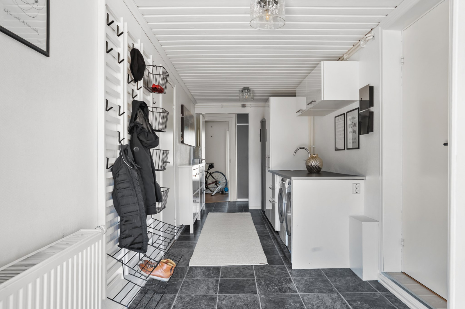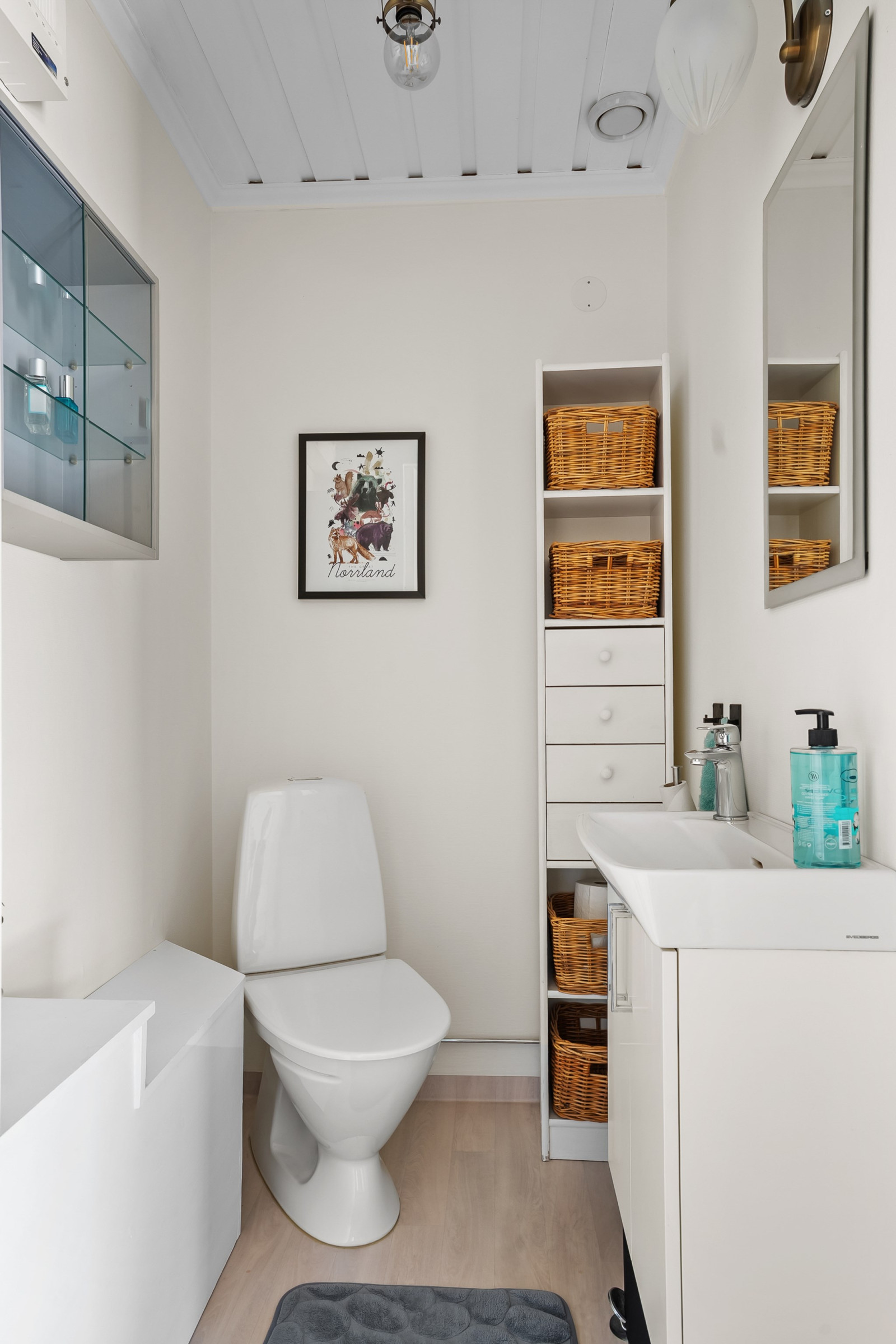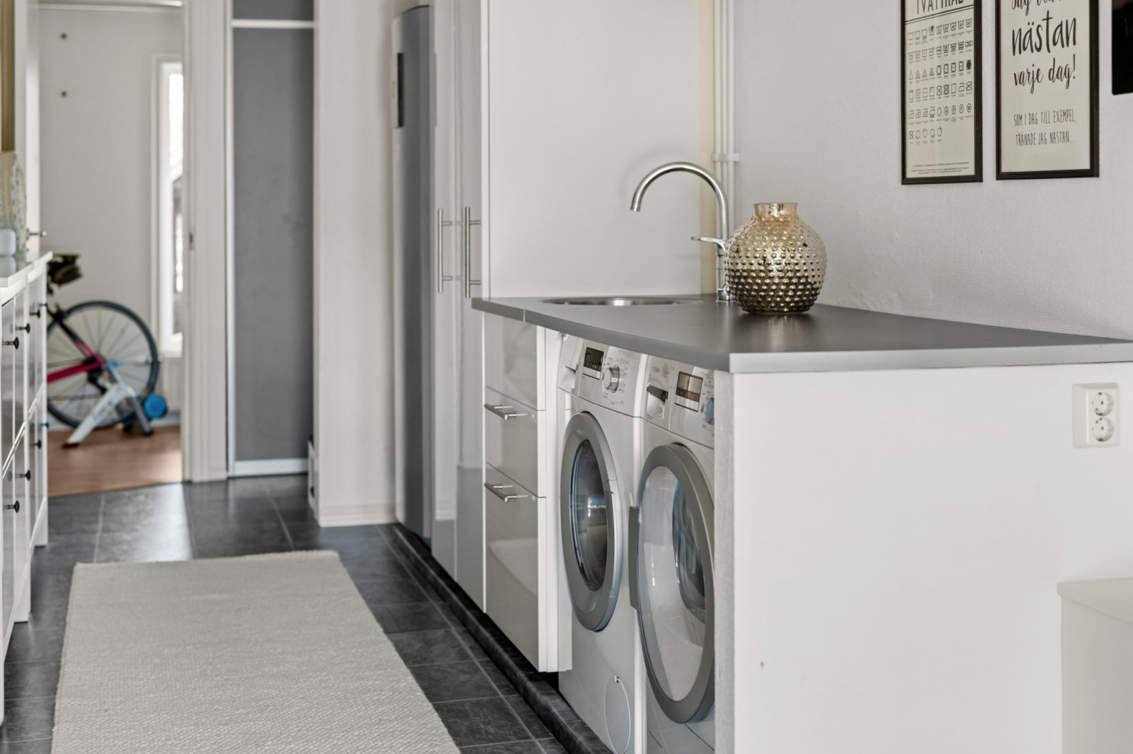 Köket är praktiskt utformat med goda arbetsytor och förvaring, perfekt för såväl vardagsmatlagning som helgens middagar. I anslutning finns tvättstuga med smidig funktionalitet i vardagen. Bostaden erbjuder både ett badrum och en separat WC, vilket underlättar för familjelivet.
