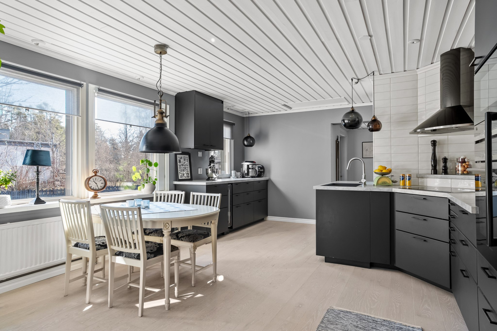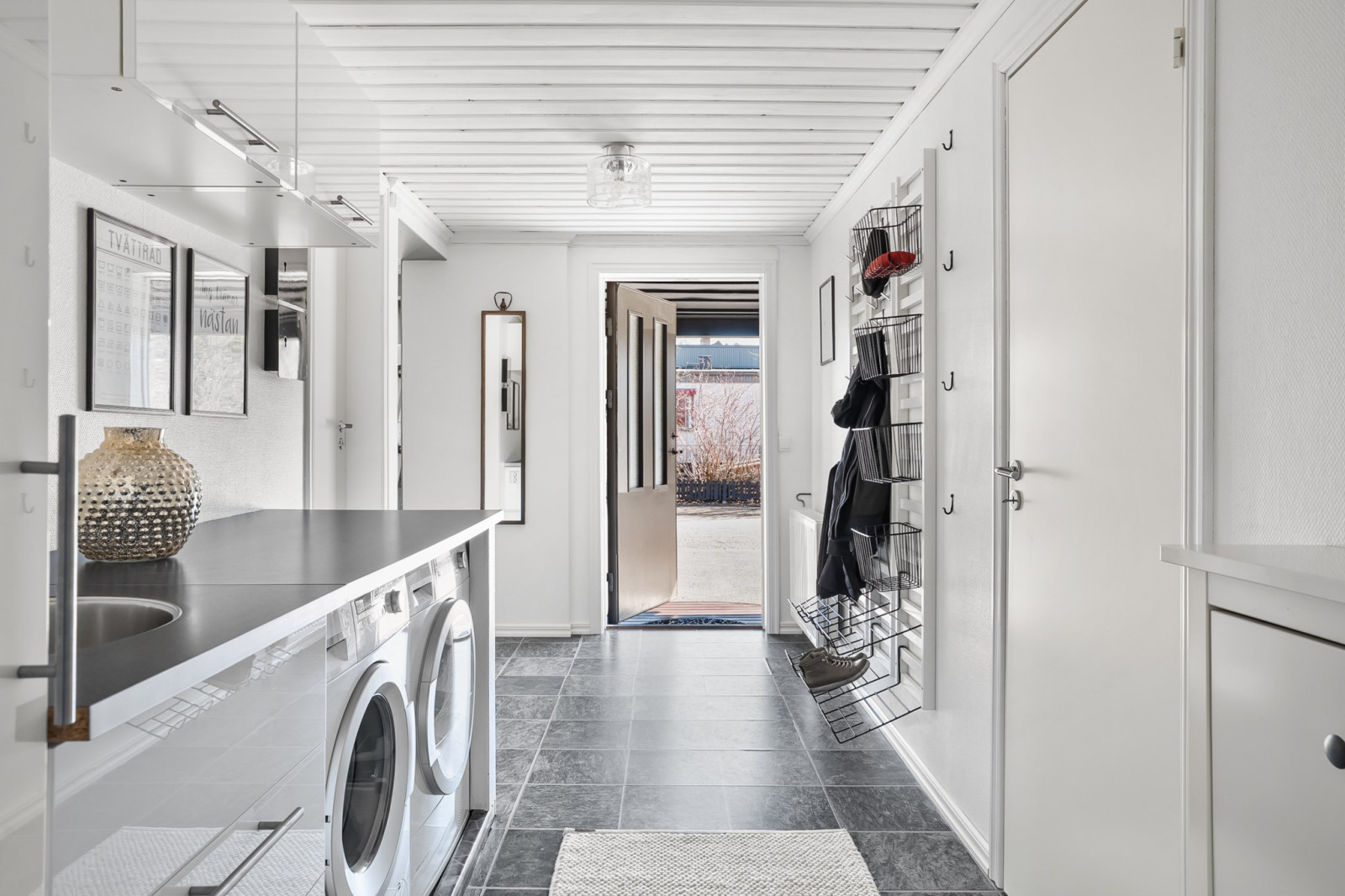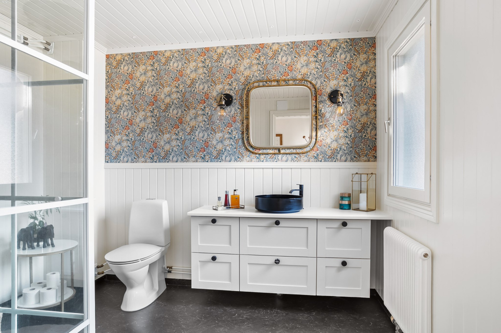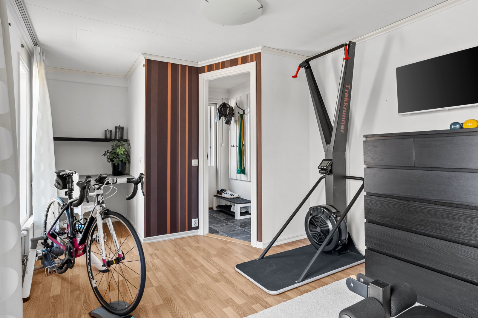Köket är praktiskt utformat med goda arbetsytor och förvaring, perfekt för såväl vardagsmatlagning som helgens middagar. I anslutning finns tvättstuga med smidig funktionalitet i vardagen. Bostaden erbjuder både ett badrum och en separat WC, vilket underlättar för familjelivet.