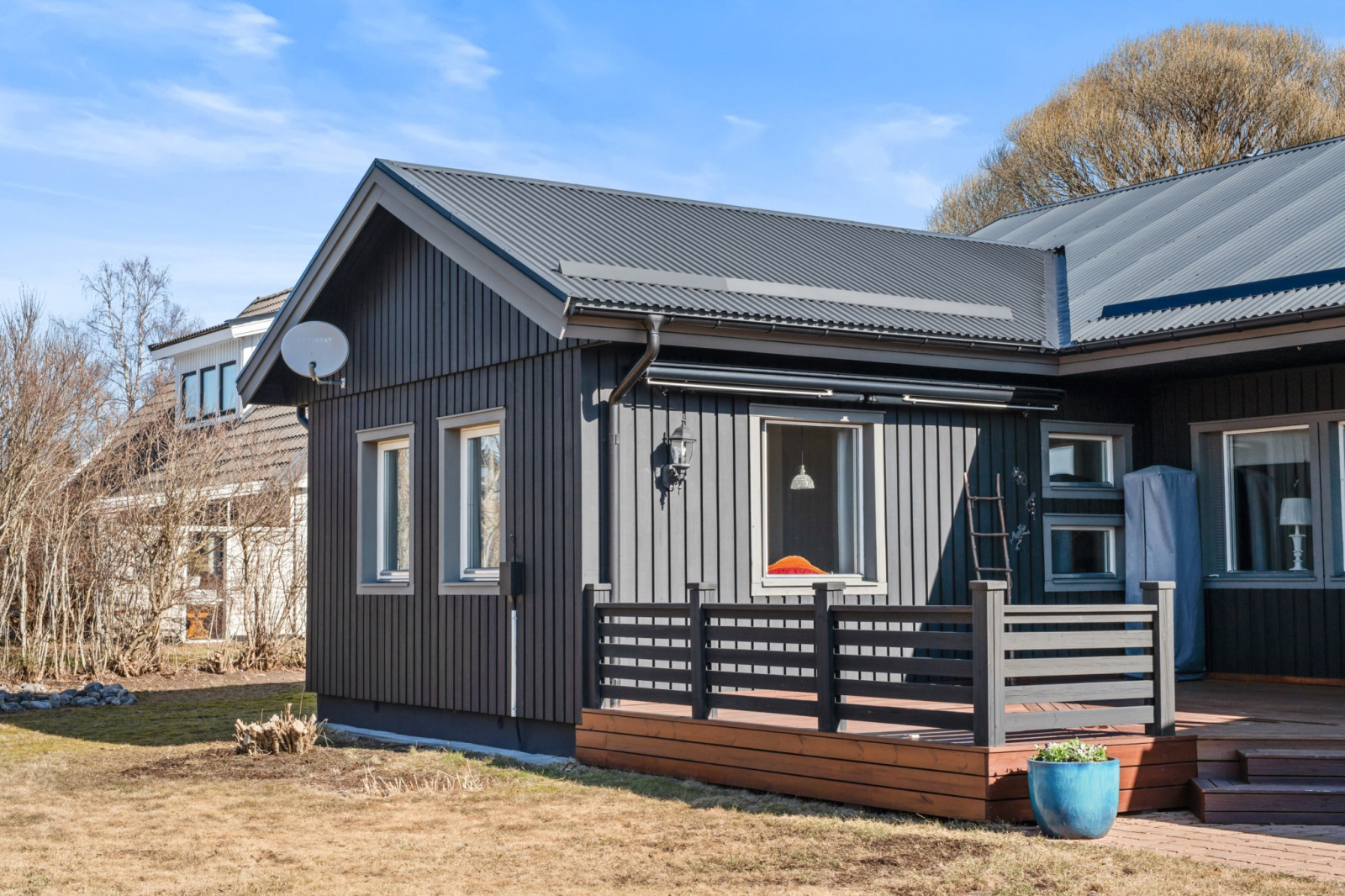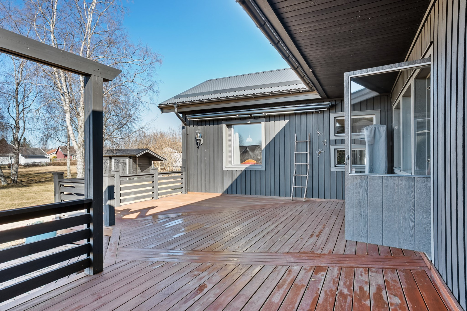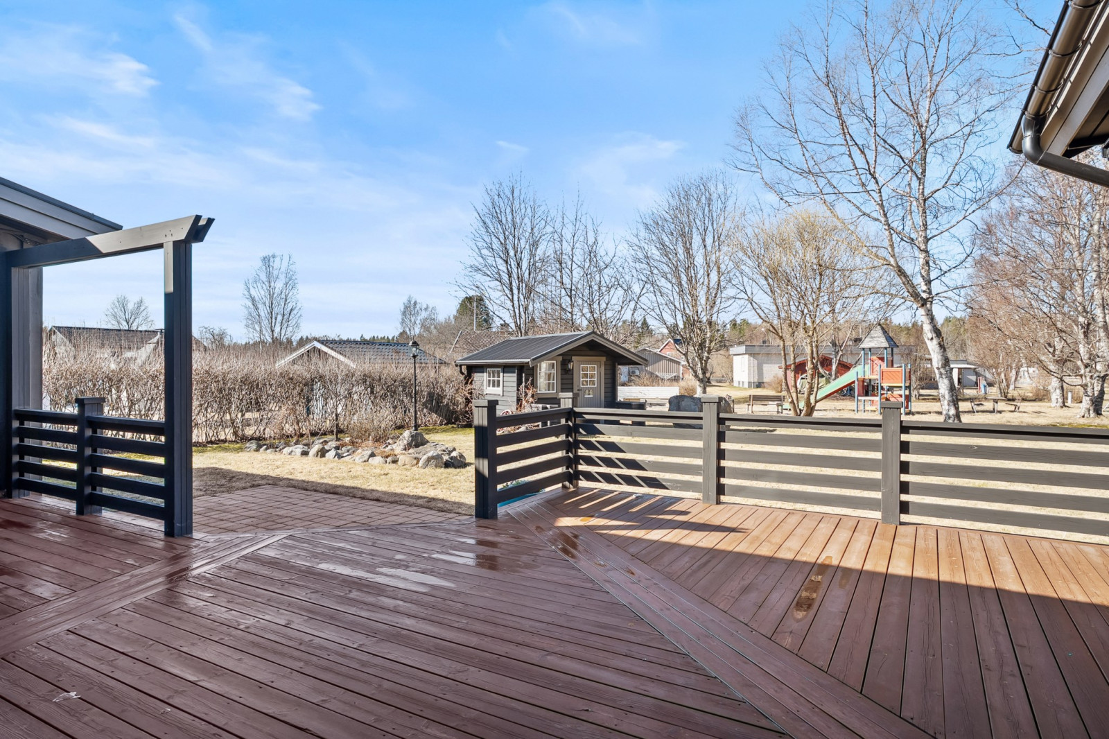 På baksidan väntar en stor och härlig tomt med en generös altan i västerläge. Här kan du njuta av eftermiddags- och kvällssol i en privat och rofylld miljö – perfekt för grillkvällar, umgänge eller lugna stunder i solen.