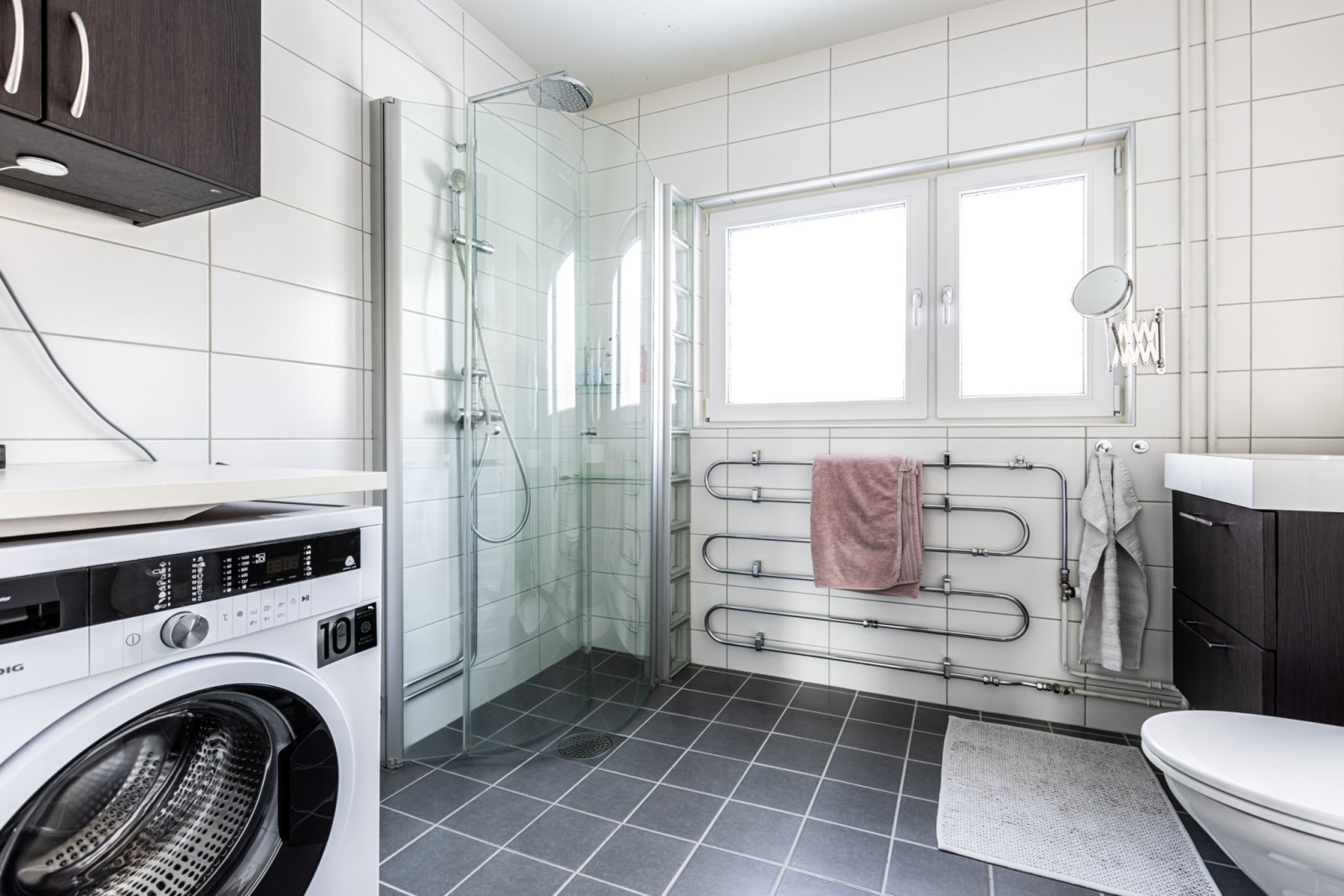 Stort och fräscht med kakel och klinkers. Badrummet är försett med tvättmaskin, överskåp för extra förvaring, toalett, handfat met kommod, dusch med vikbara glasväggar, handdukstork och spegel.
