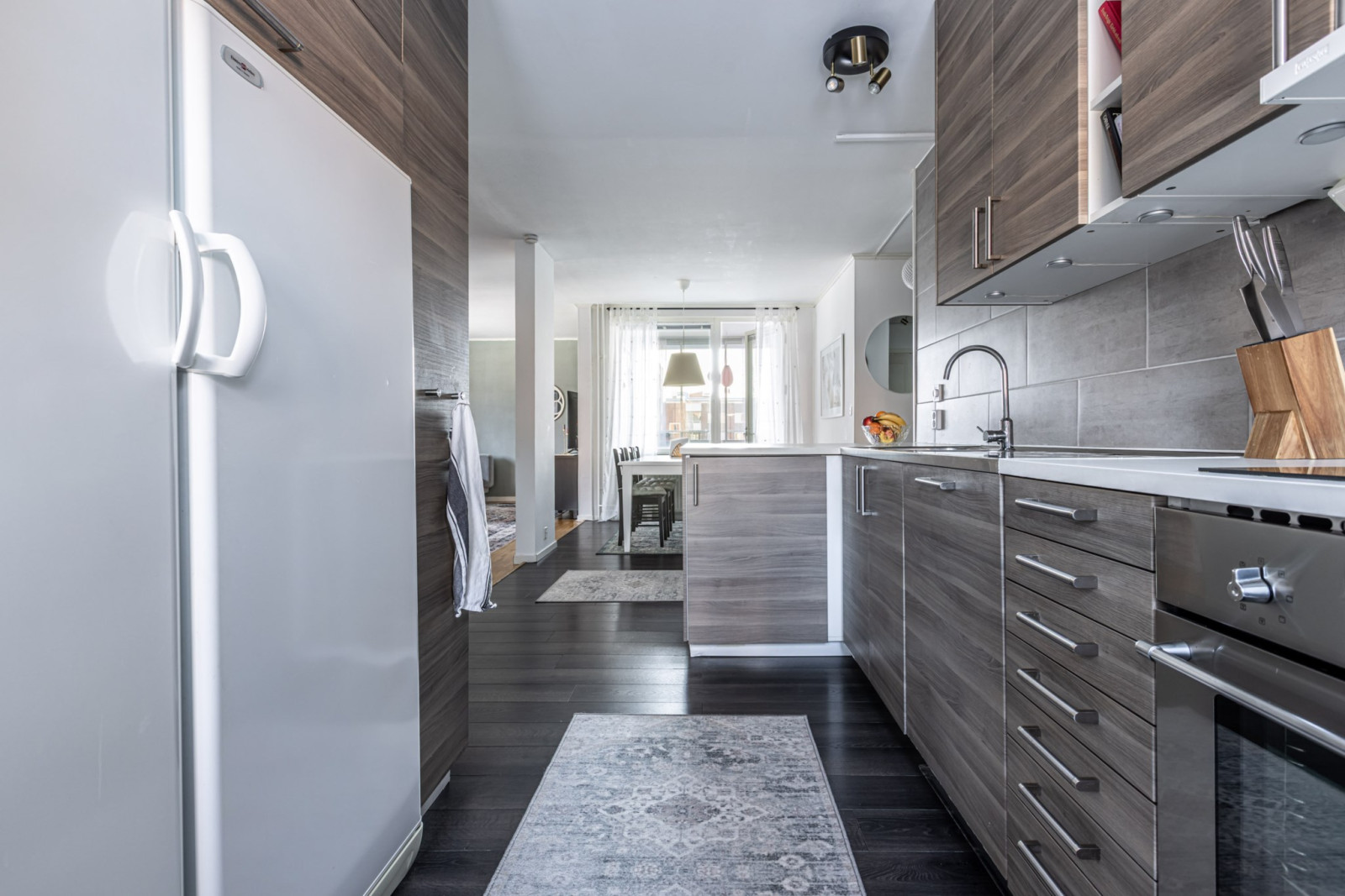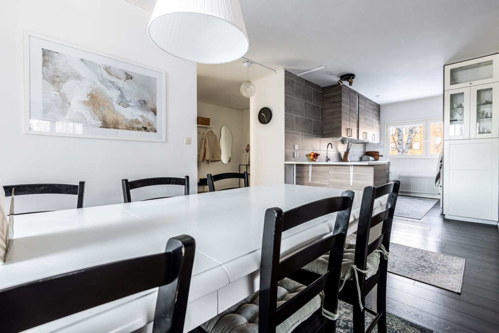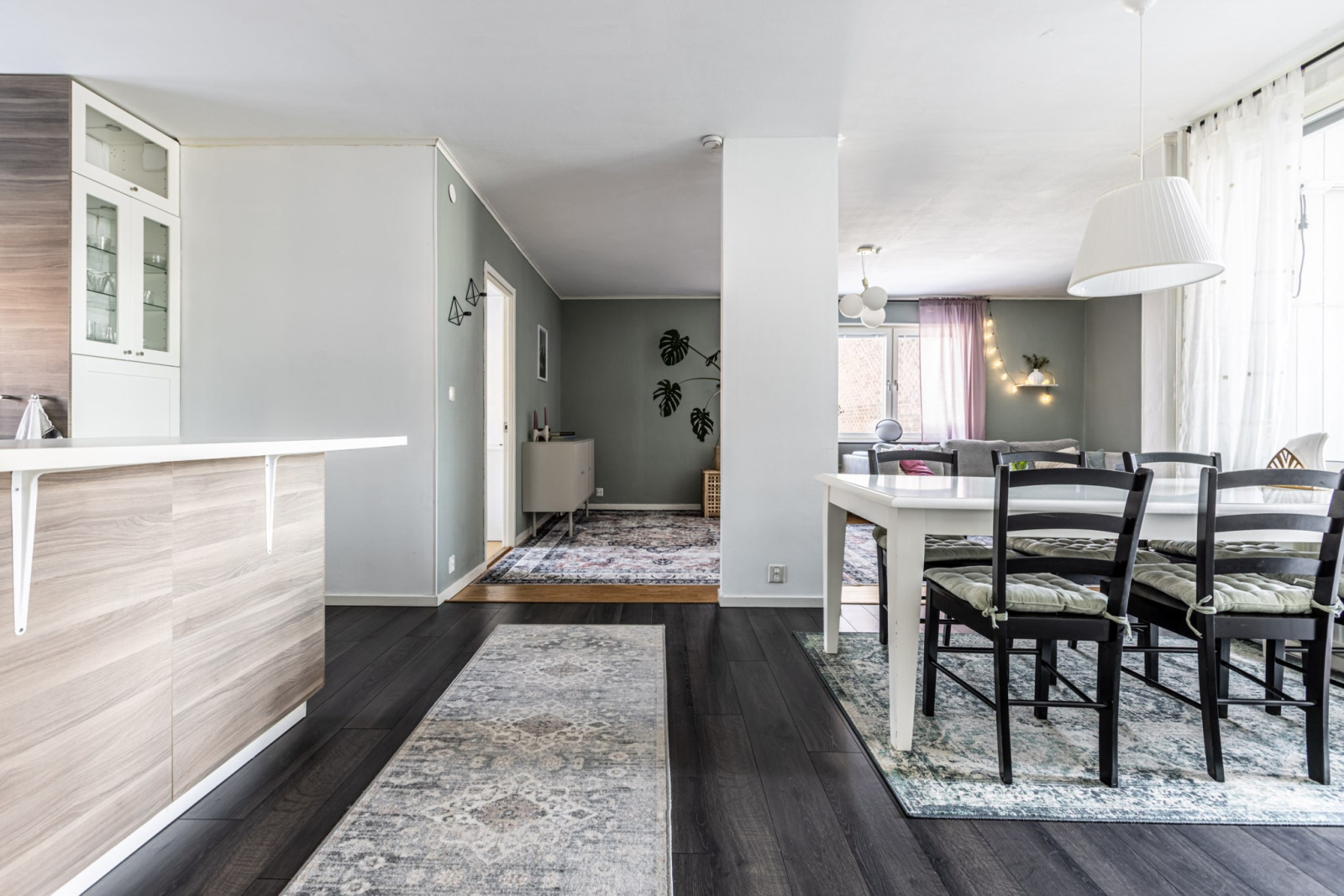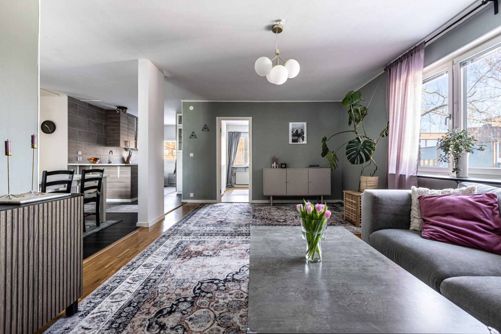 Köket och vardagsrummet samspelar i en öppen och social planlösning, idealisk för både vardag och umgänge. Härifrån nås även den inglasade balkongen i soligt söderläge – en perfekt plats att njuta av solen från tidig vår till sen höst.