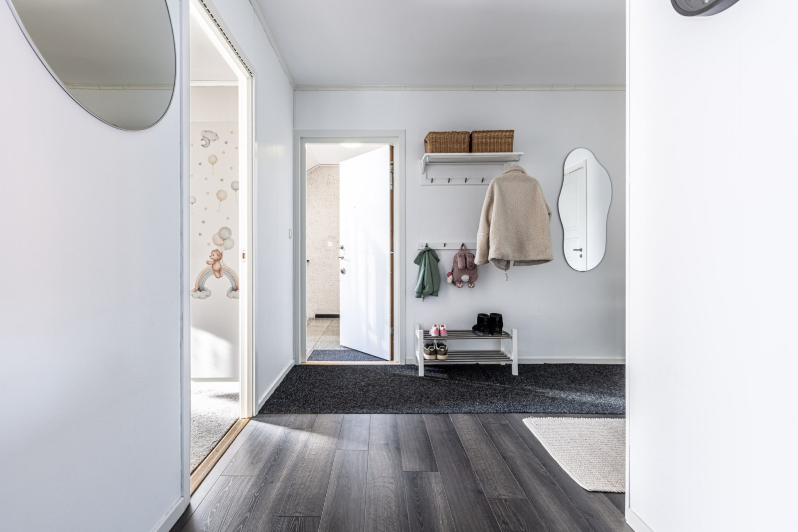 Bostaden har två generösa sovrum med gott om plats för både förvaring och arbetsyta – perfekt för såväl familjen som den som önskar hemmakontor. Det stilrena badrummet är utrustat med egen tvättmaskin, vilket ger en bekväm vardag.