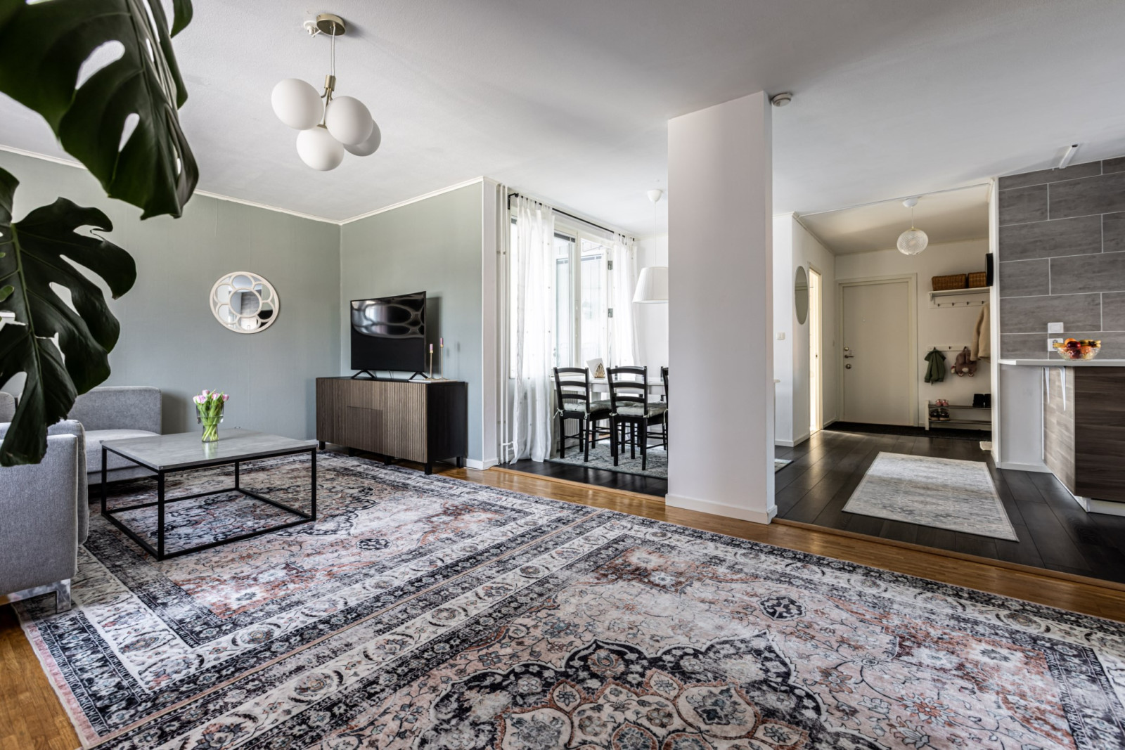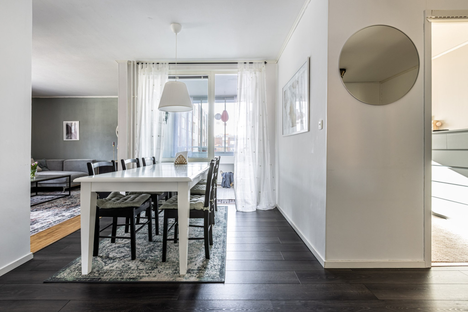 Stort och ljust vardagsrum med gott om ljusinsläpp. Här har man plats för en stor matgrupp, gedigen soffgrupp, vardagsrum bord, tv-bänk och annat möblemang som kan önskas.