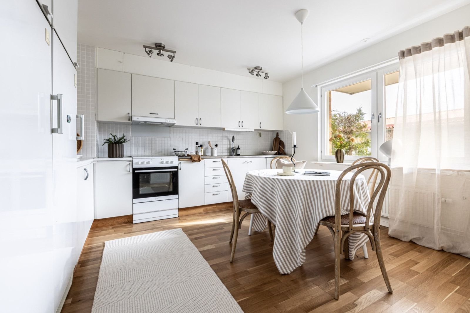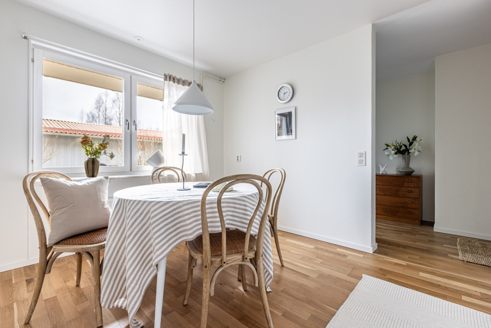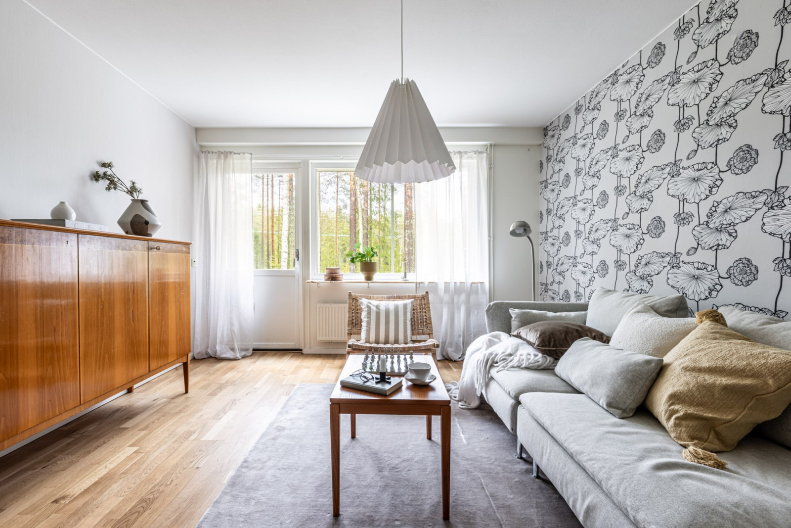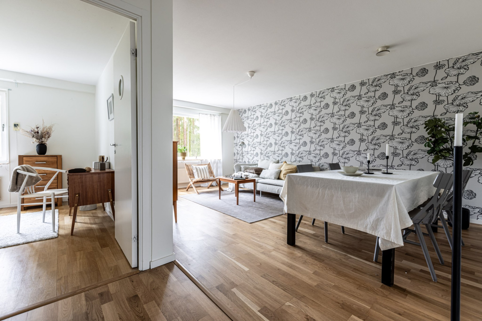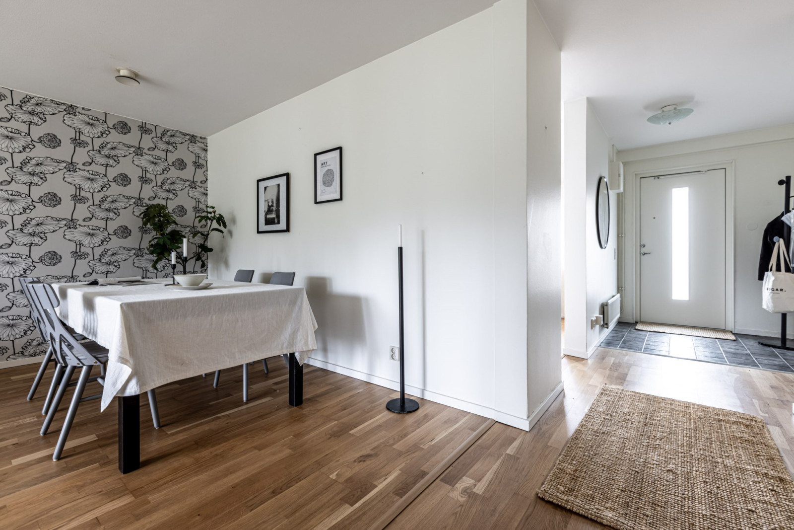 Lägenheten erbjuder en genomtänkt planlösning med generösa ytor och fint ljusinsläpp. Det rymliga vardagsrummet är hemmets naturliga samlingspunkt, med stora fönsterpartier och utgång till den trevliga altanen i norrläge. Här kan du njuta av lugnet och den rogivande utsikten mot skogen – en perfekt plats för morgonkaffet, middagar under sommarkvällarna eller en stunds avkoppling i grönskan.