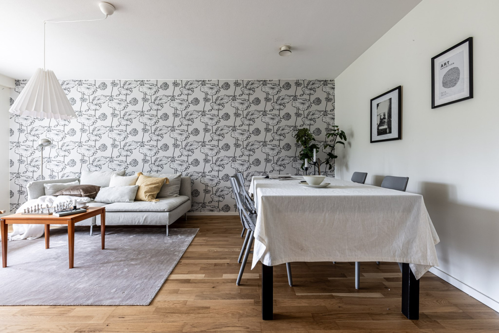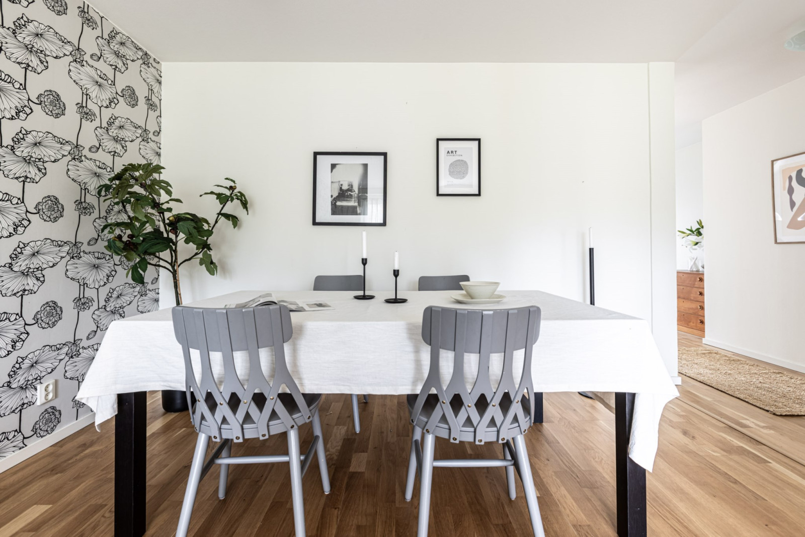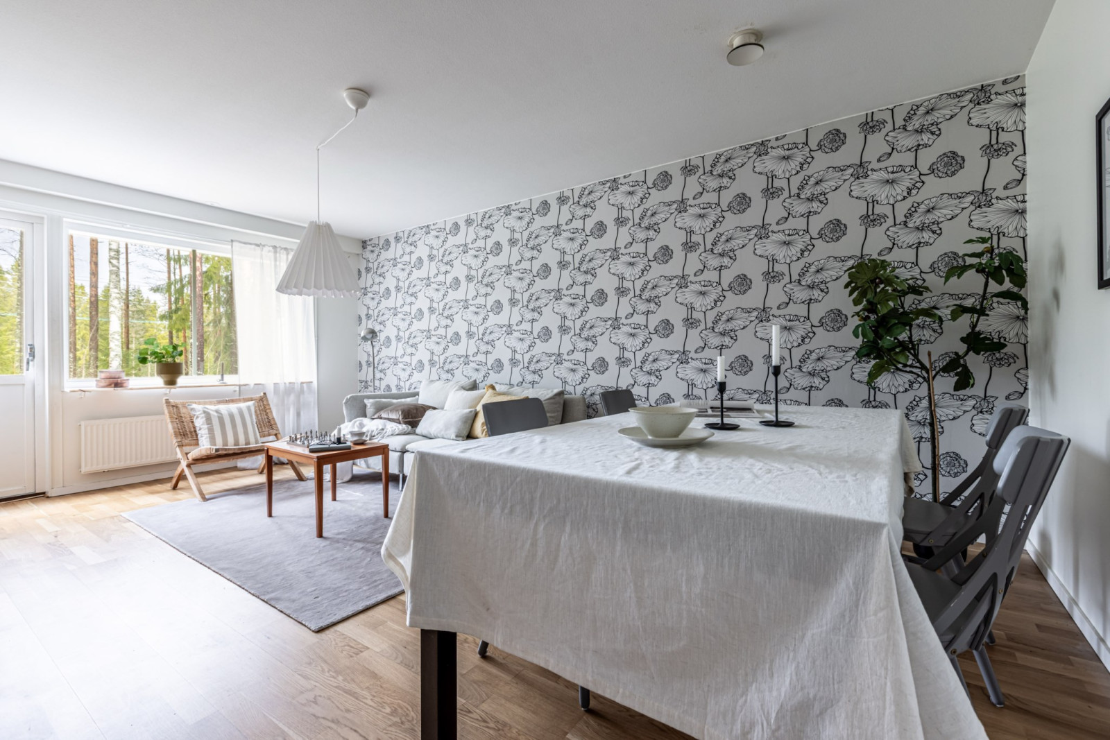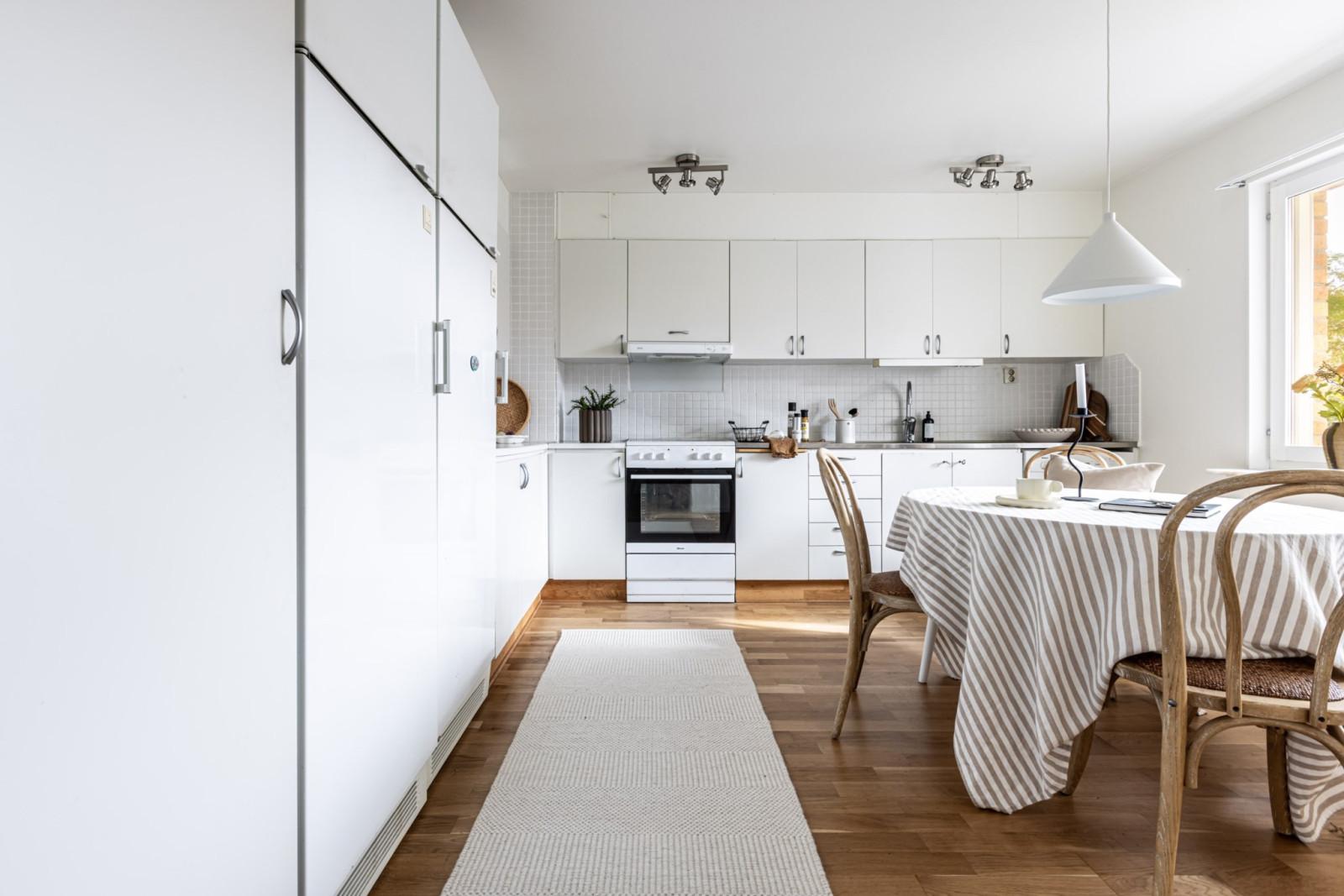 Lägenheten erbjuder en genomtänkt planlösning med generösa ytor och fint ljusinsläpp. Det rymliga vardagsrummet är hemmets naturliga samlingspunkt, med stora fönsterpartier och utgång till den trevliga altanen i norrläge. Här kan du njuta av lugnet och den rogivande utsikten mot skogen – en perfekt plats för morgonkaffet, middagar under sommarkvällarna eller en stunds avkoppling i grönskan.