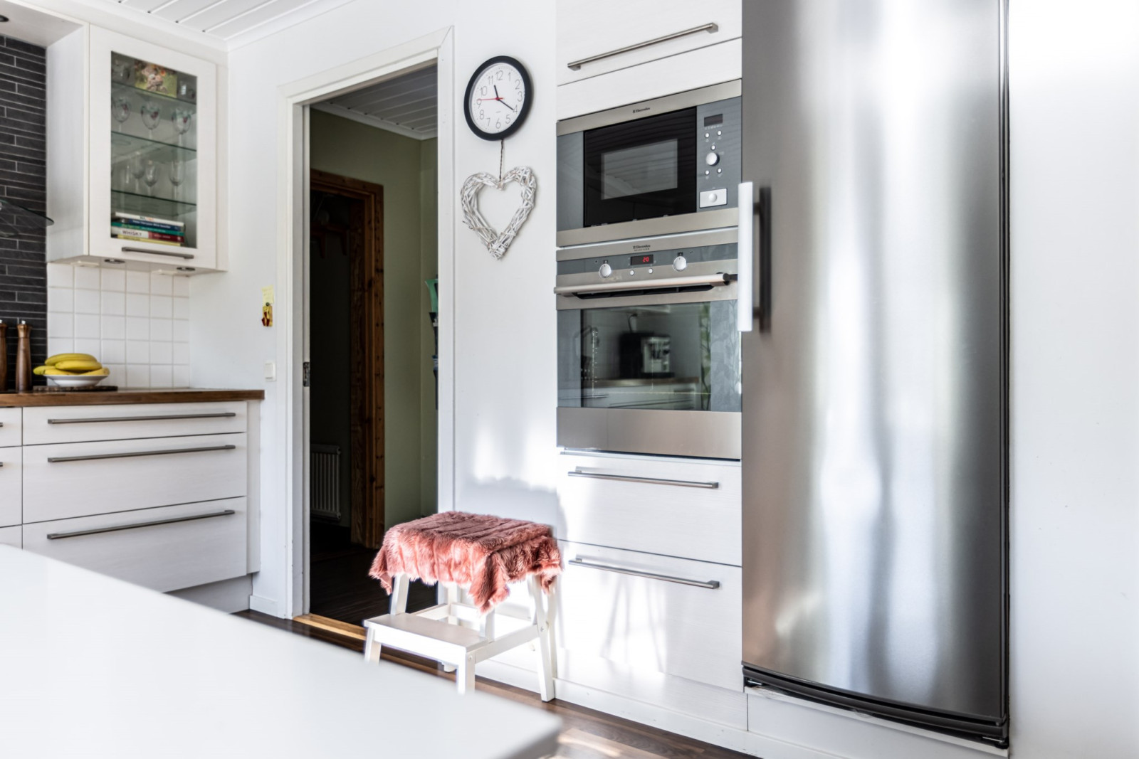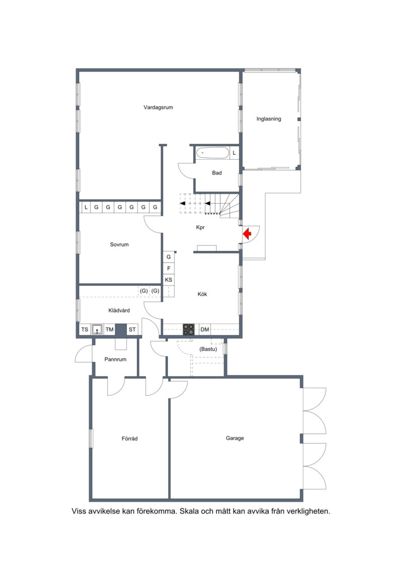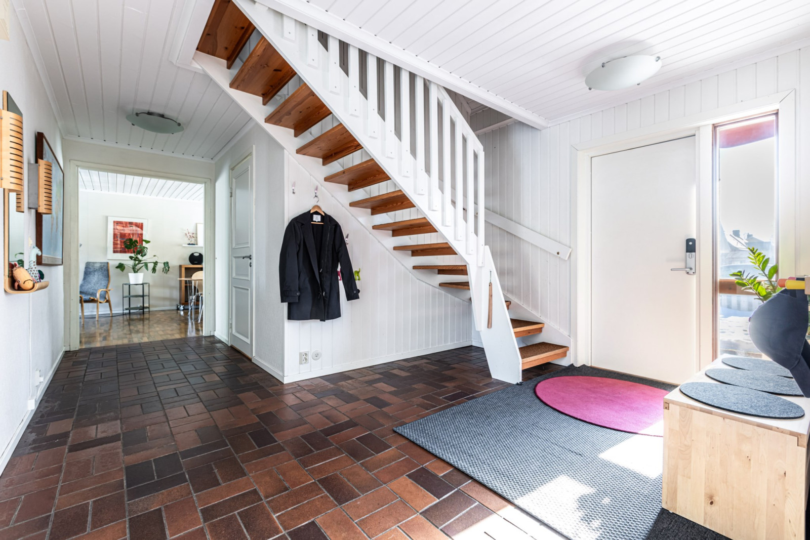 Välkomnande entré med öppen hall som ger ett luftigt första intryck. Direkt till vänster nås köket som erbjuder gott om arbetsytor och förvaring. Från köket finns även vidare passage till husets praktiska del med tvättstuga, bastu, förråd samt direkt access till garaget.