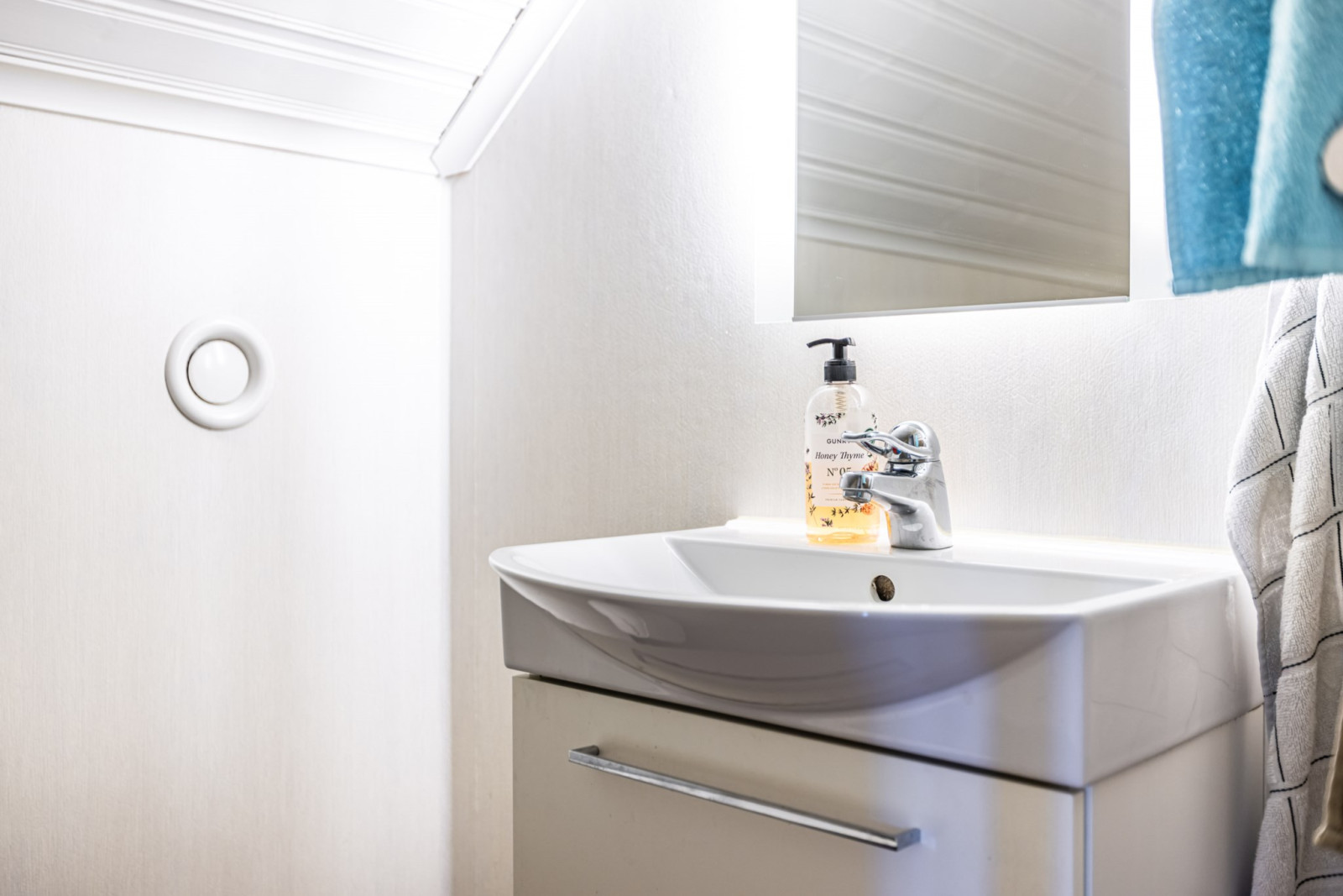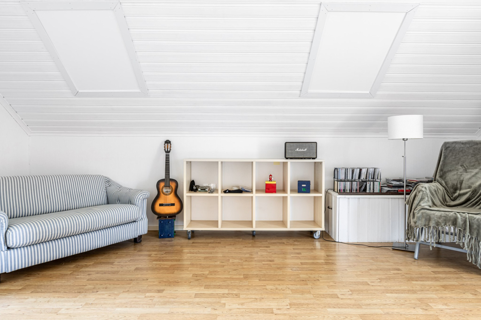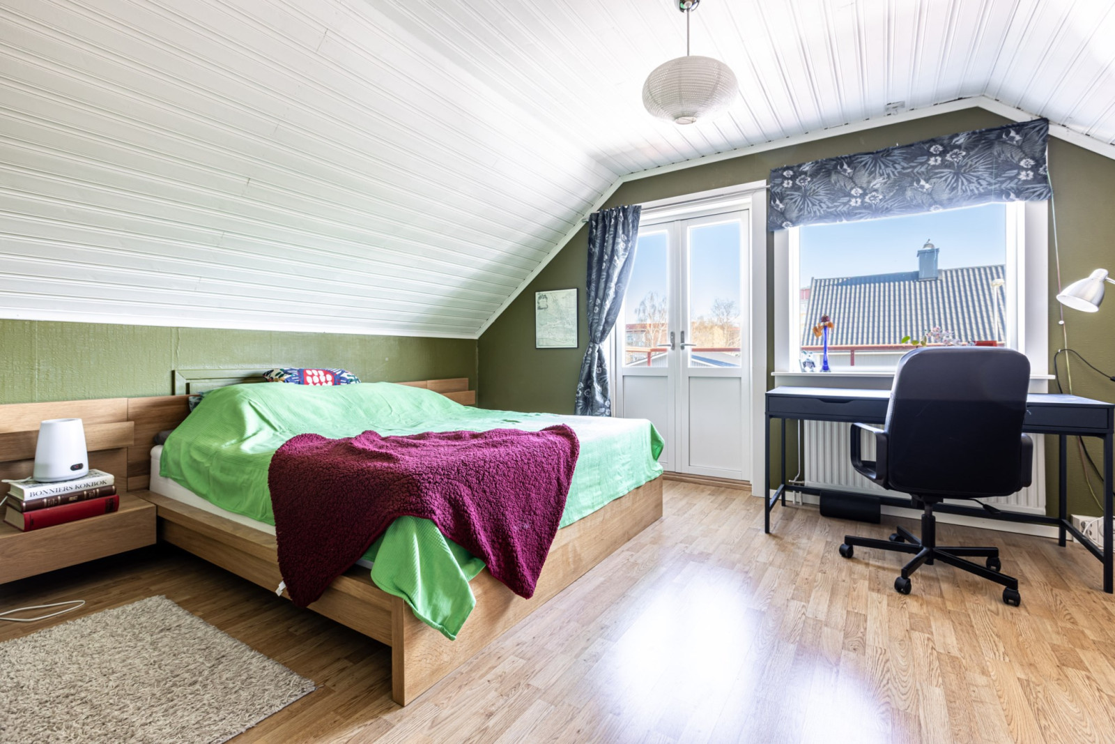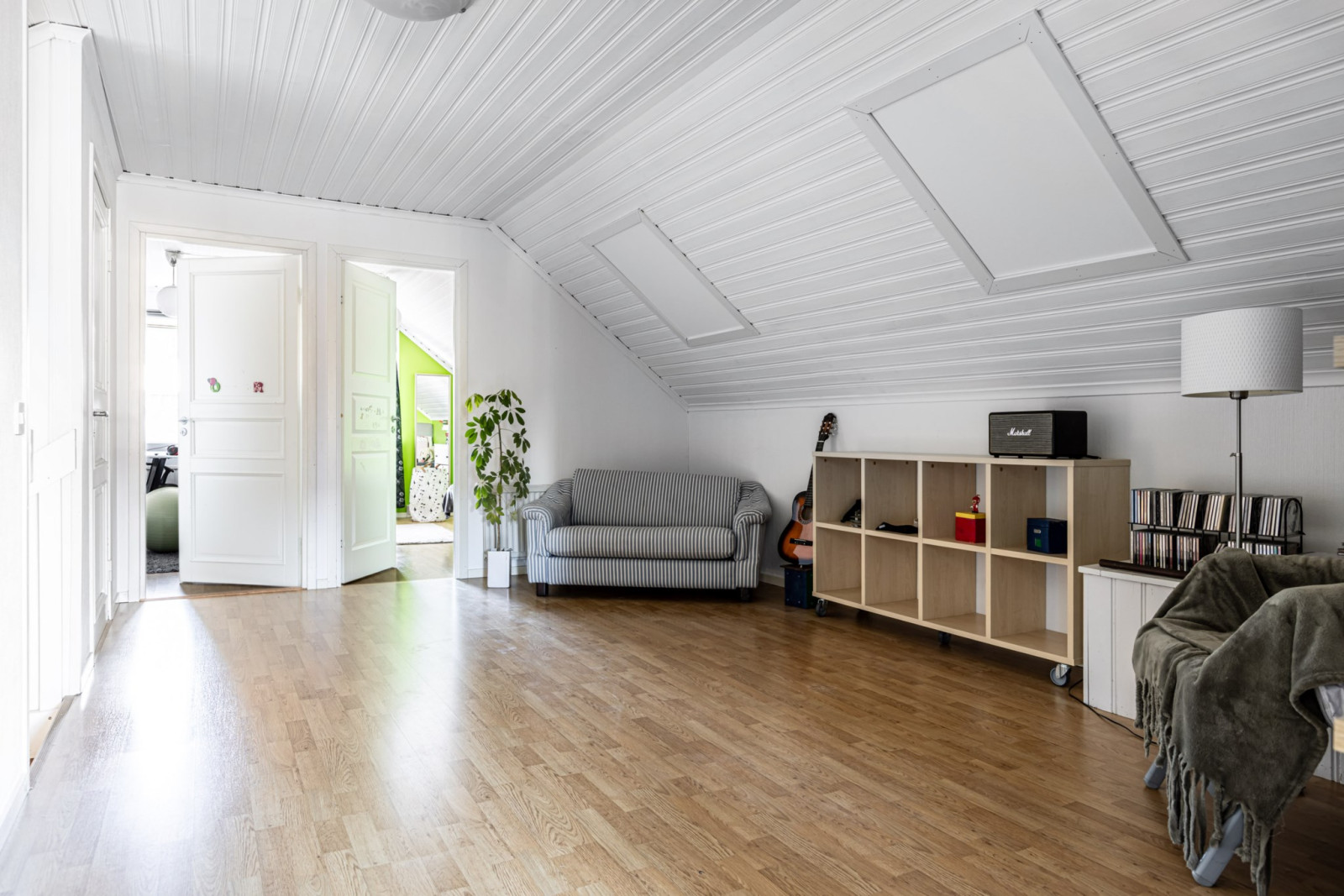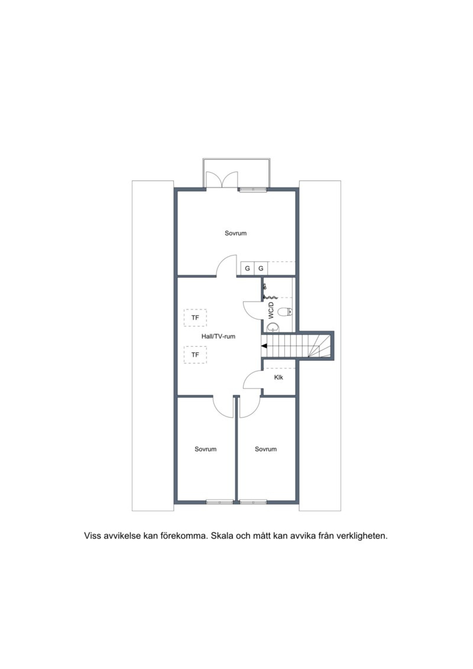 En trappa från hallen leder upp till ett öppet och ljust allrum som blir en naturlig samlingsplats för familjen. Till vänster från trappen ligger två sovrum samt ett förråd som erbjuder bra förvaringsmöjligheter.