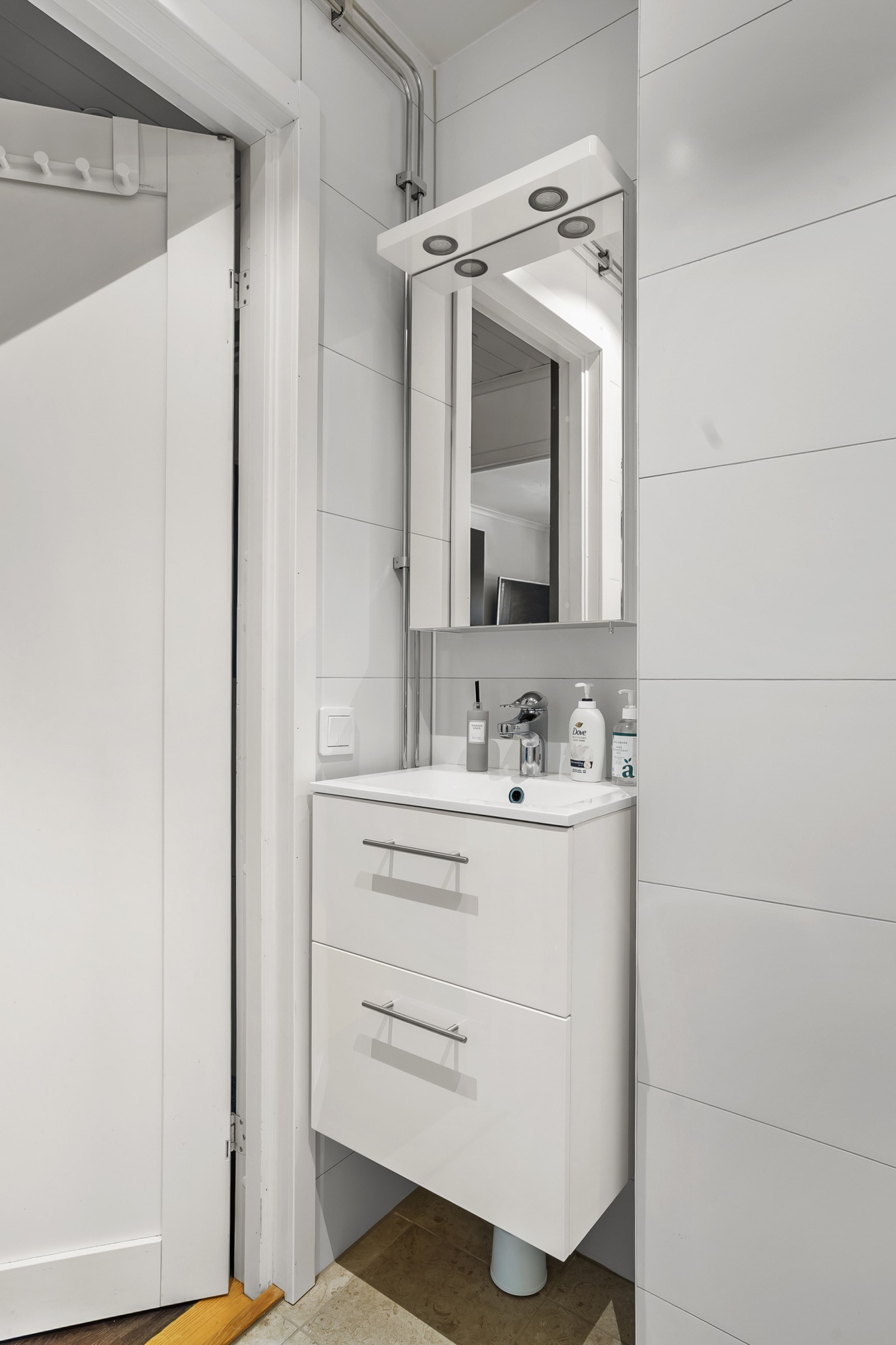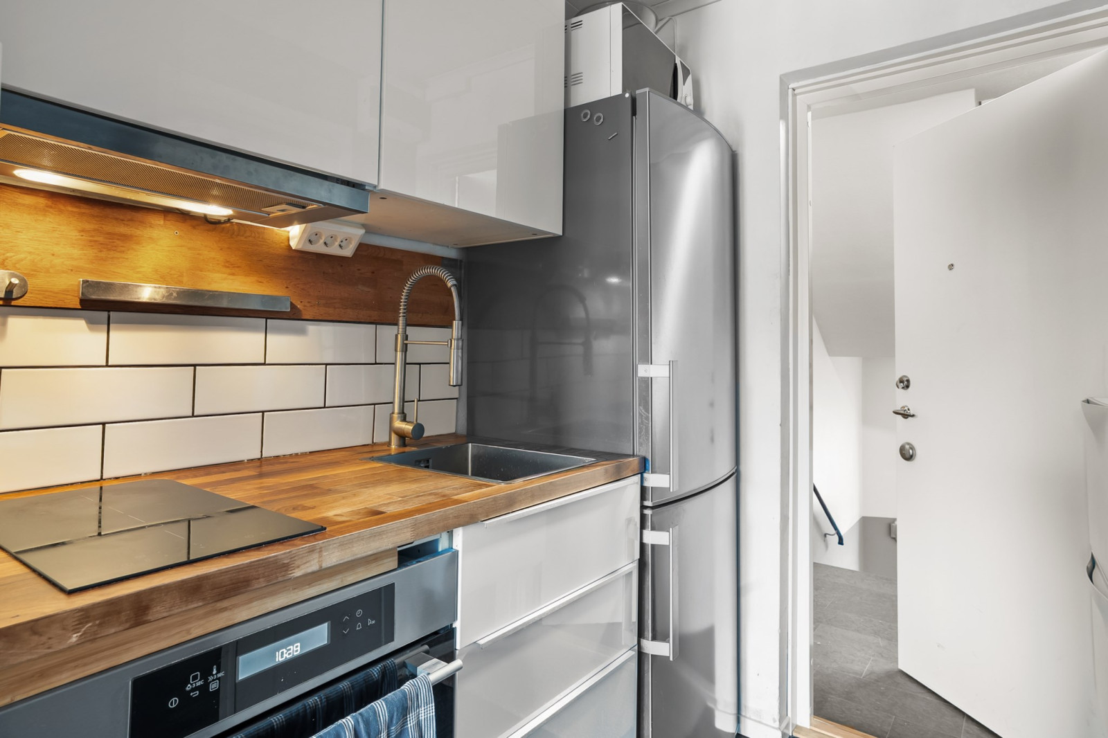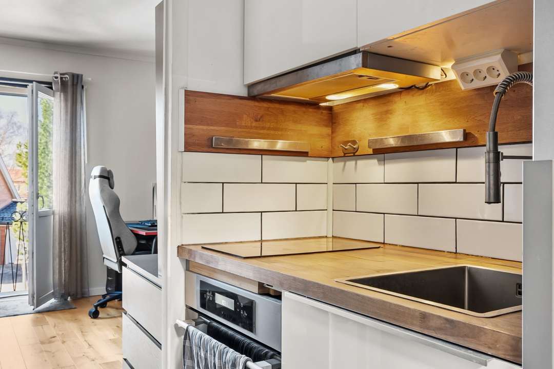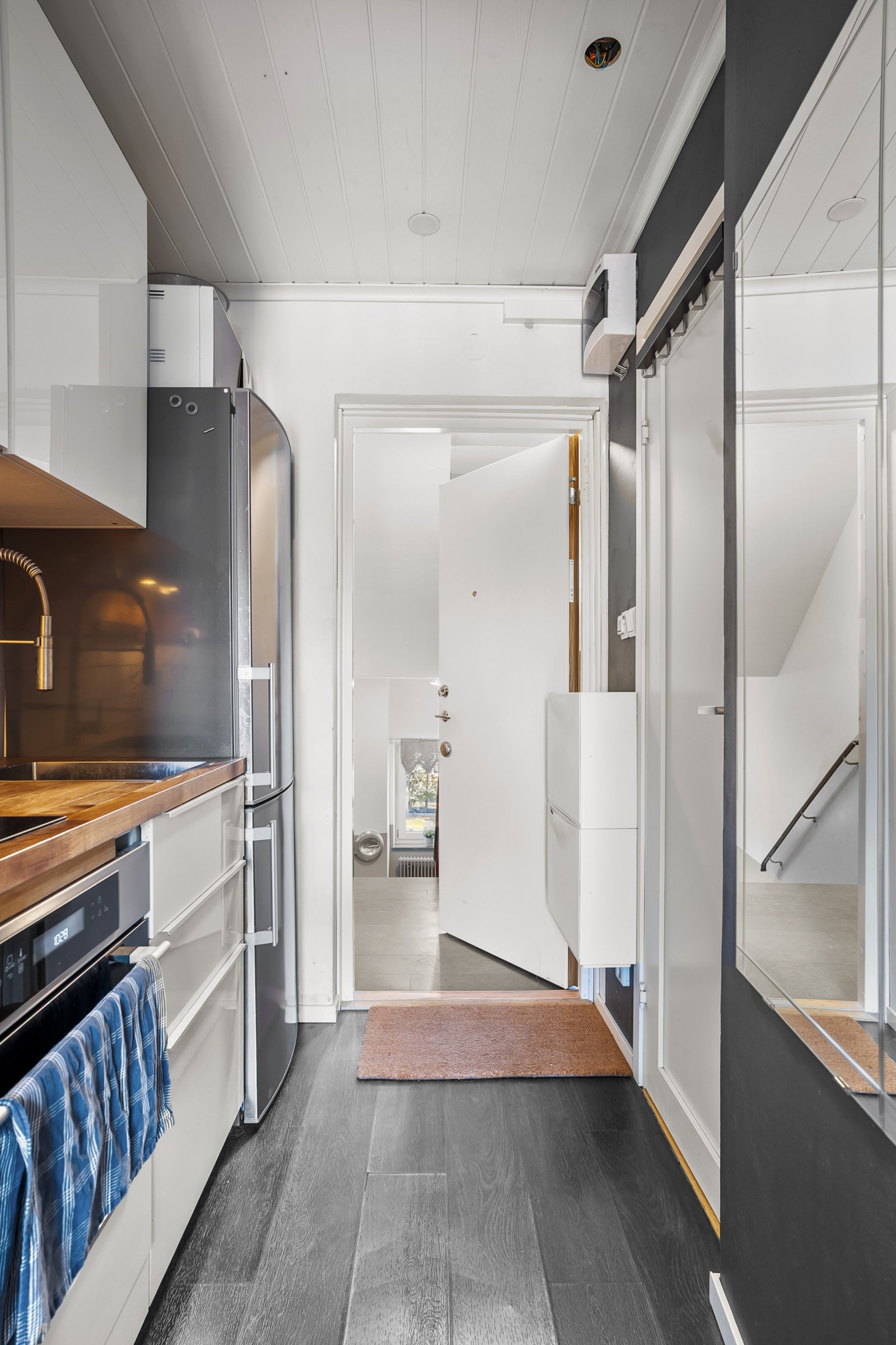 Compact living när den är som bäst! Bakom lägenhetsdörren väntar 18 välplanerade kvadratmeter. I hallen ges ni plats för avhängning av era ytterkläder och skor. Här har ni även lägenhetens kök som är försett med kombinerad kyl och frys, överskåp samt lador, ugn, stekhäll och köksfläkt.