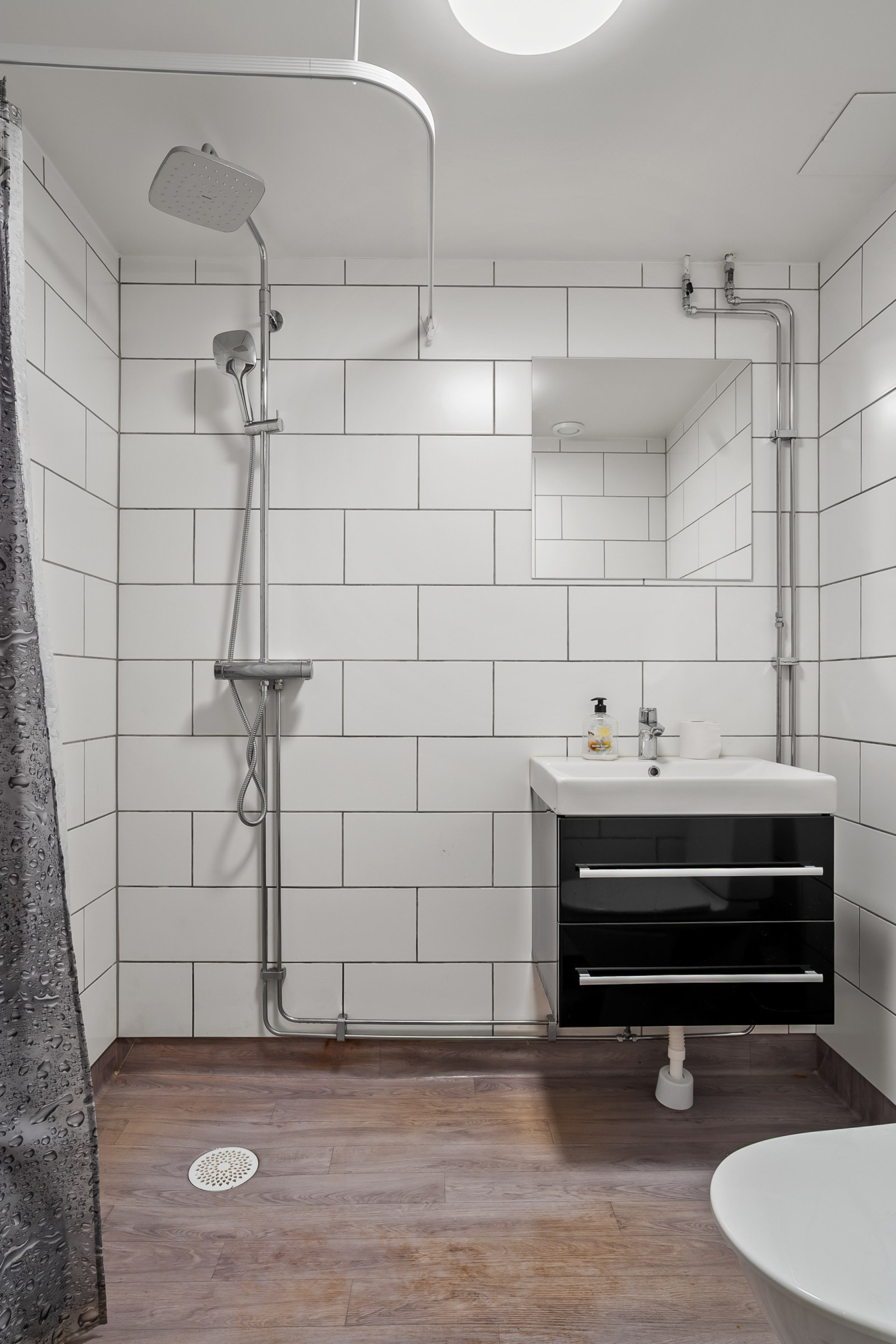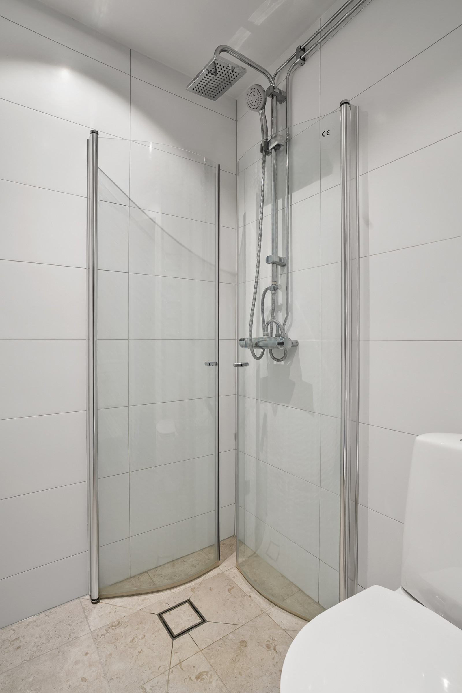Direkt till vänster om hallen finns badrummet med klinkers på väggar och golv. Badrummet är försett med toalett, handfat med kommod, spegelskåp med belysning samt dusch med vikbara glasväggar.