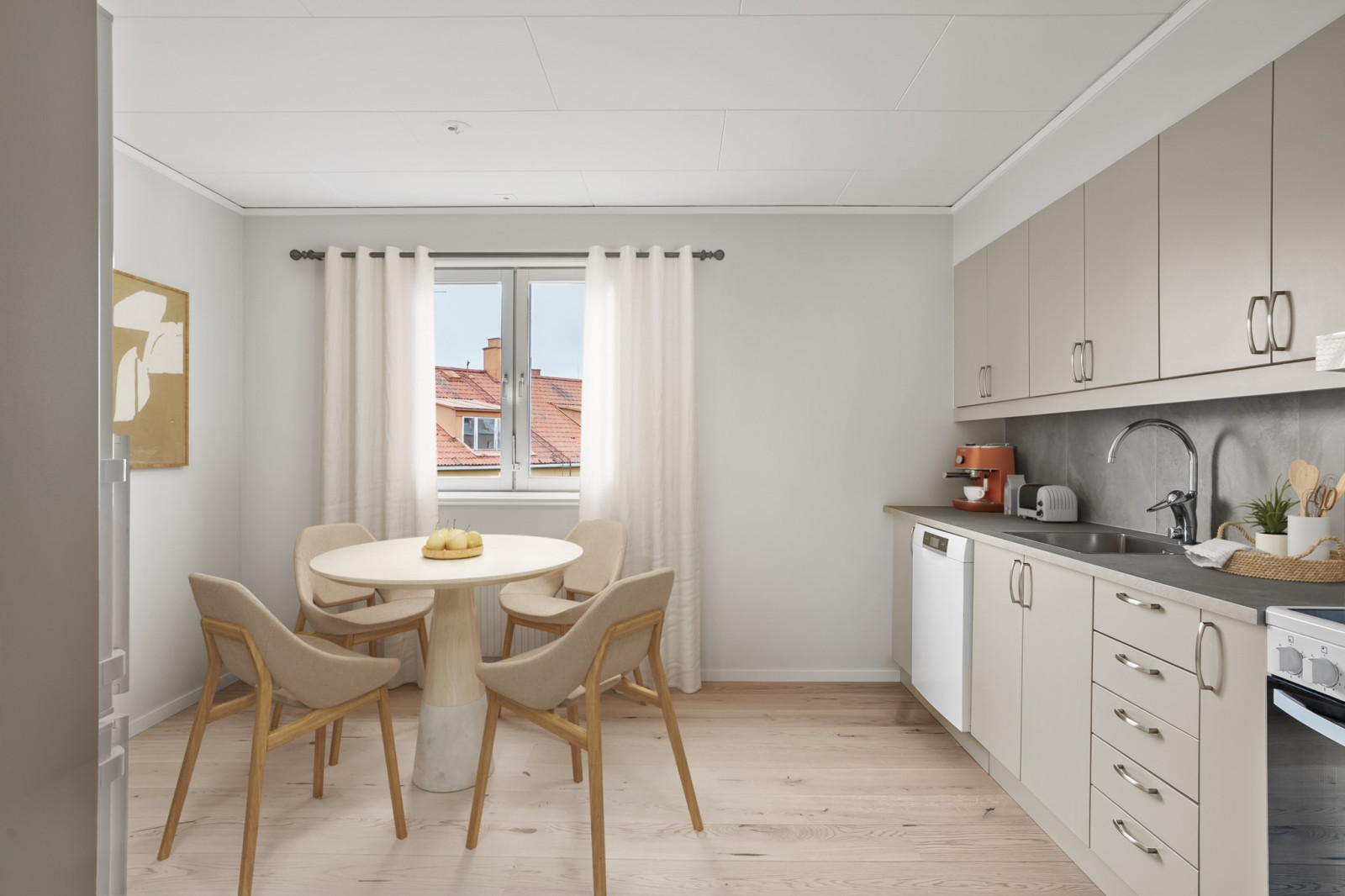Vardagsrummet är generöst tilltaget och blir hemmets självklara samlingspunkt, med direkt utgång till den trevliga balkongen i västerläge. Här kan du njuta av eftermiddagssol och ljumma sommarkvällar med utsikt över omgivningarna.